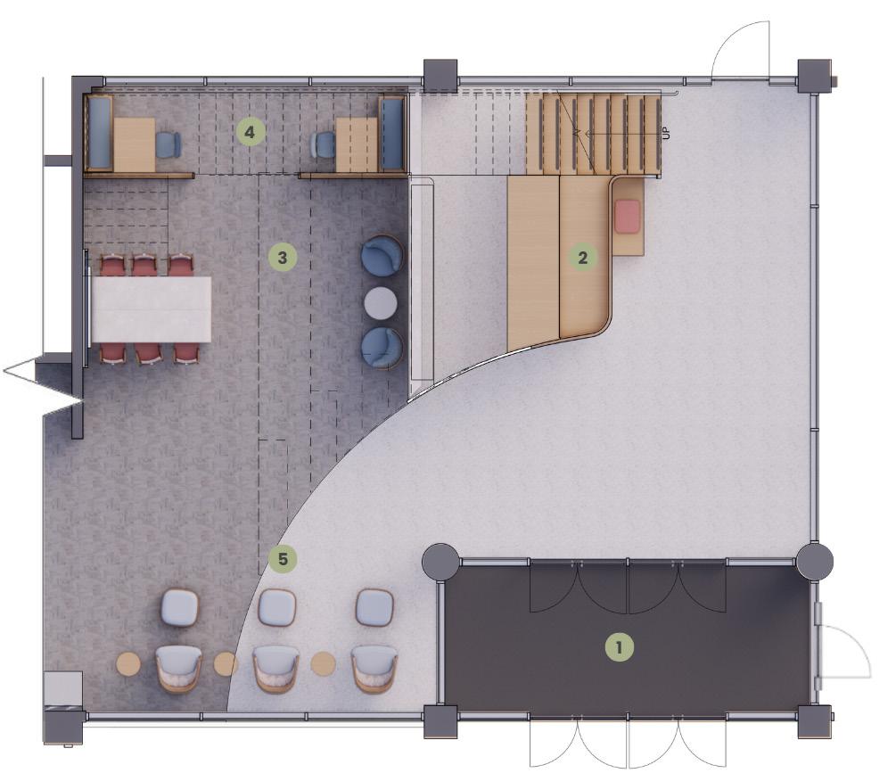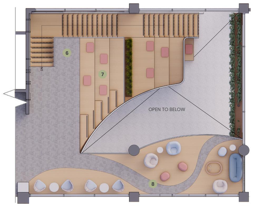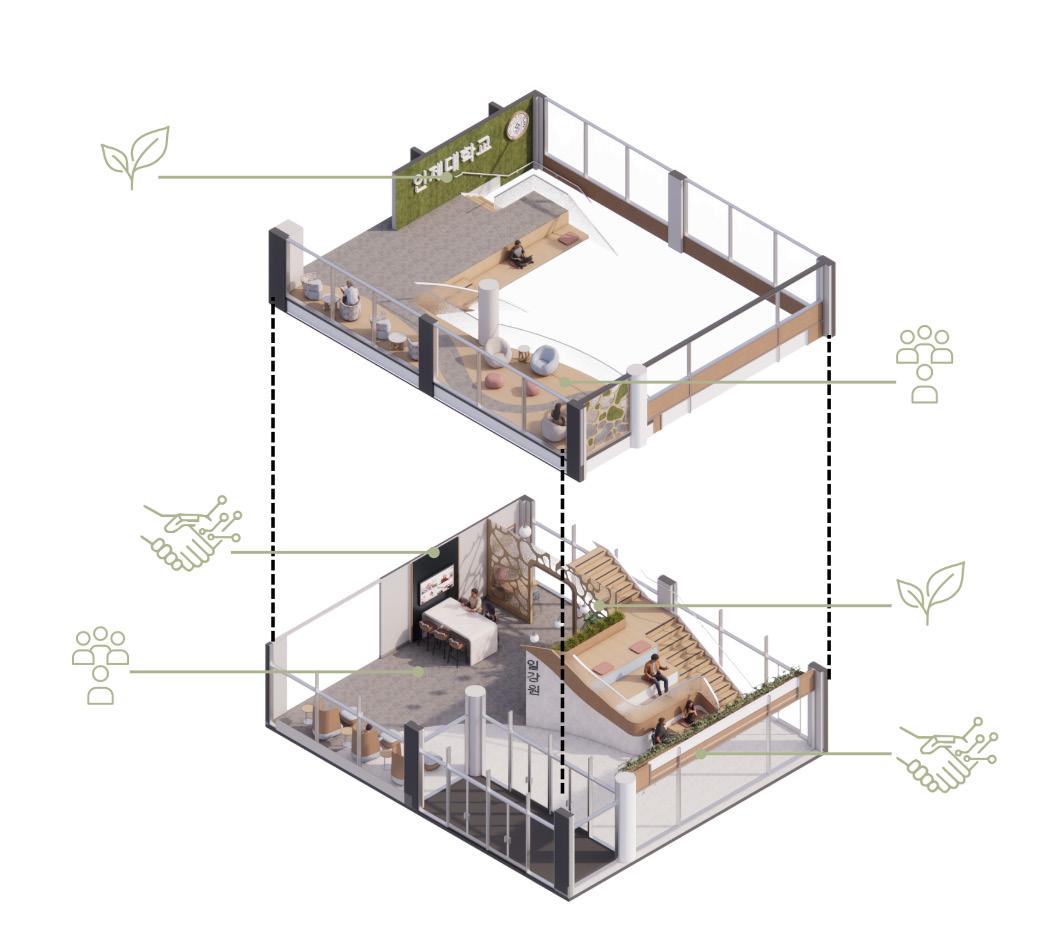 By integrating sociopetal and sociofugal design strategies, biophilic elements, and innovative technology, Illgangwon becomes a space that promotes mental health, supports well-being, and empowers students to create their own unique “imprint” on campus life.