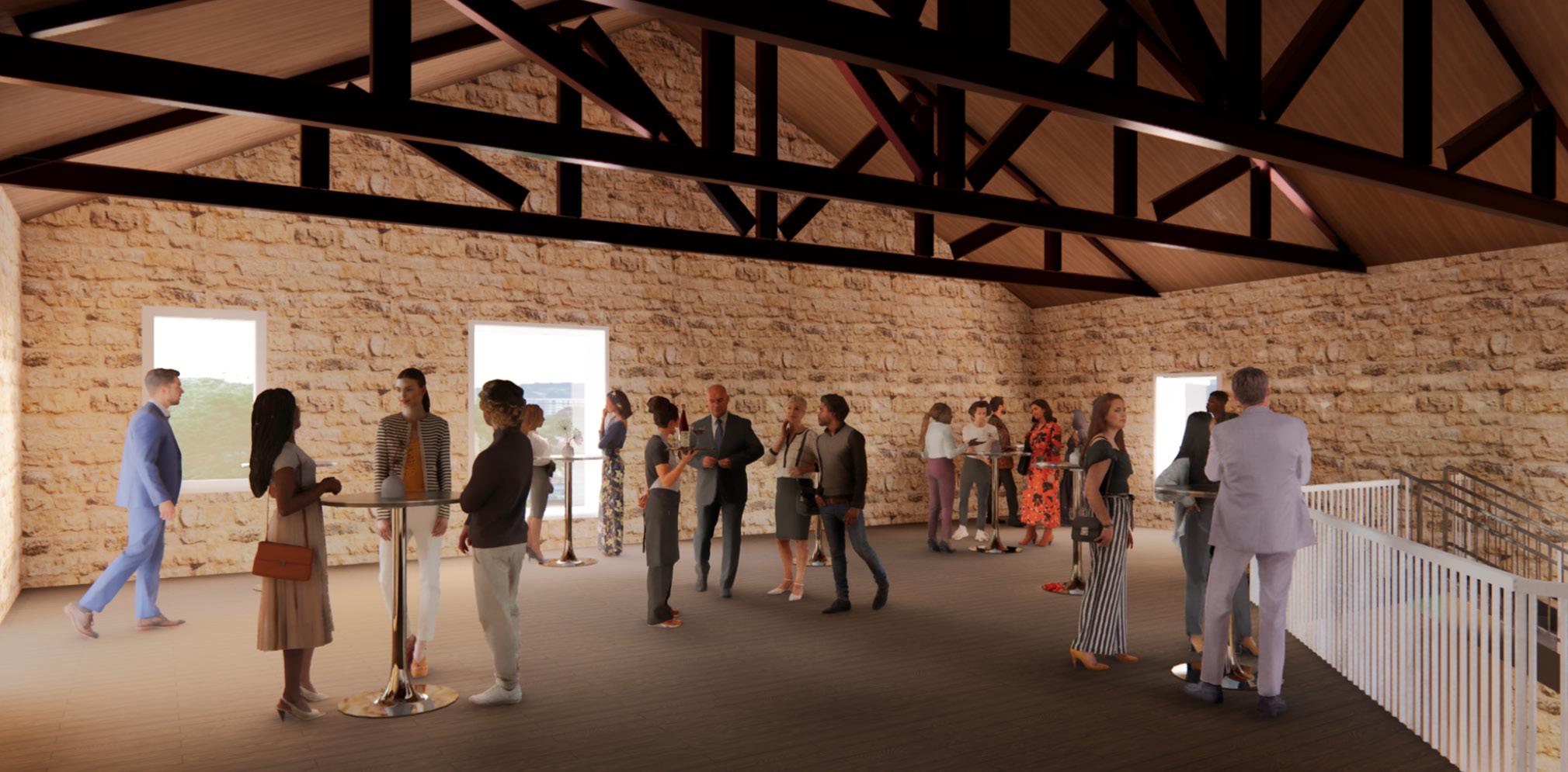 The interior materials follow a neutral color palette, highlighting the original limestone as the home’s defining feature.