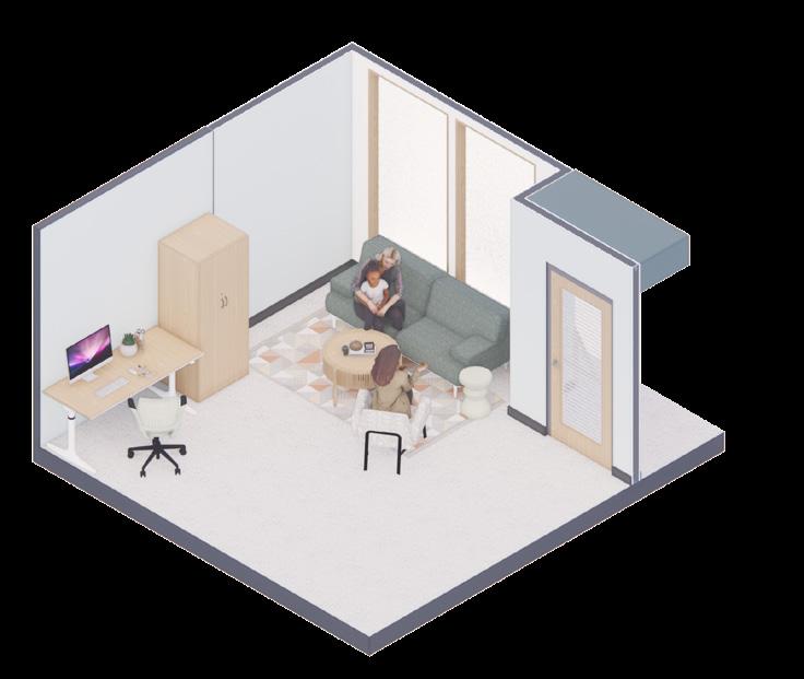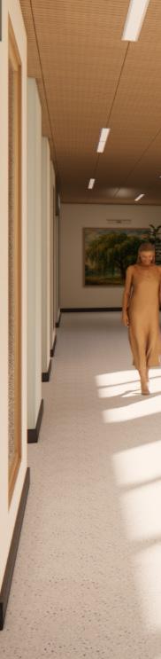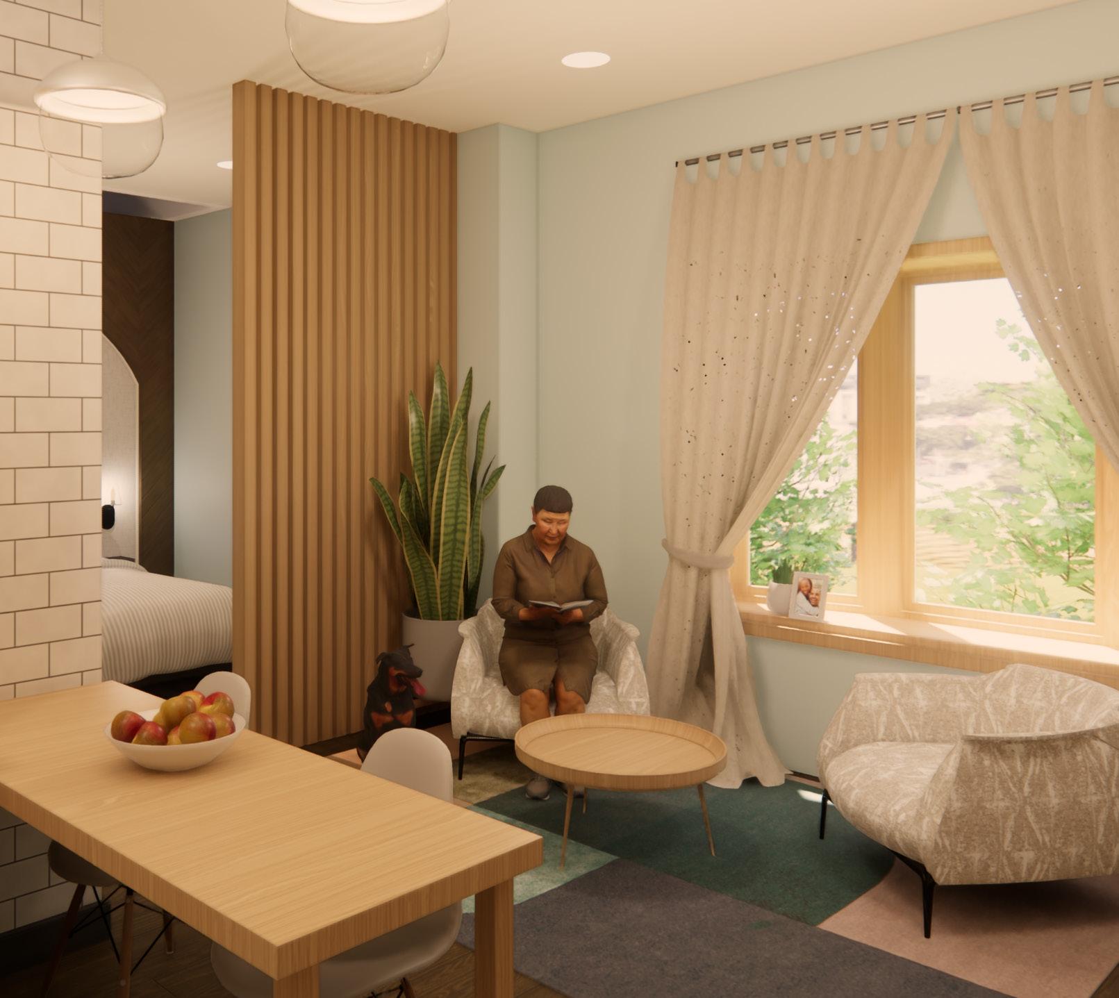 Independent living apartments offer a supportive step between the transition of fulltime care and community reintegration. Two unit sizes promote adaptability and a clear, simple layout supports ease of navigation Soft, adaptable lighting and textiles create a sensory supportive independent space to enhance dignity and life skills while still having access to skilled professionals if necessary.