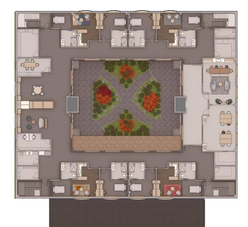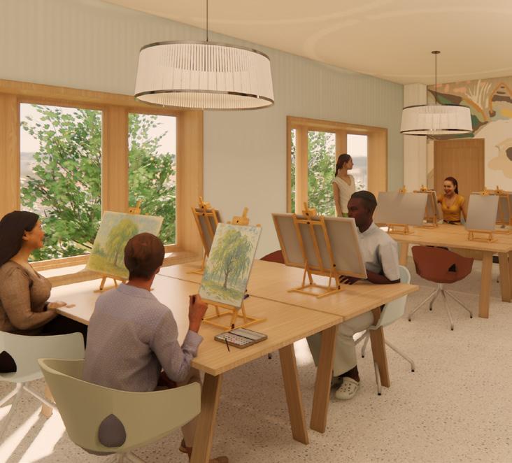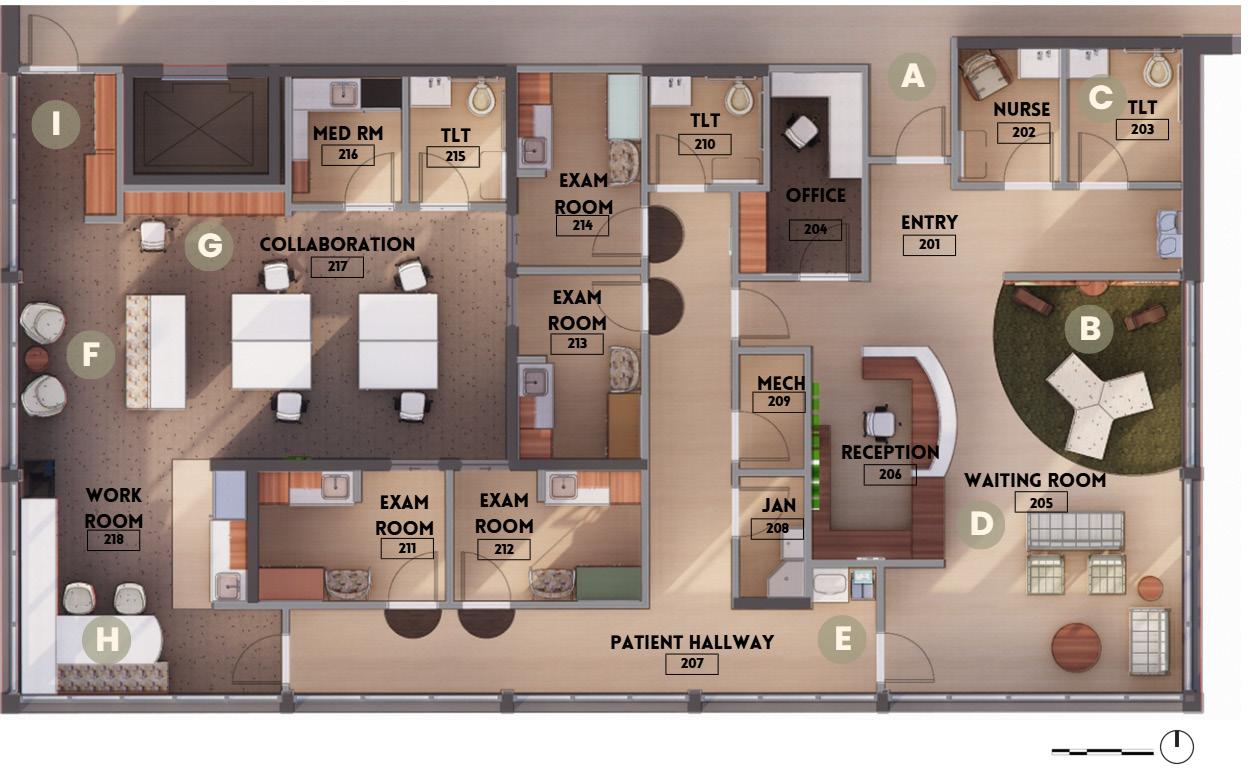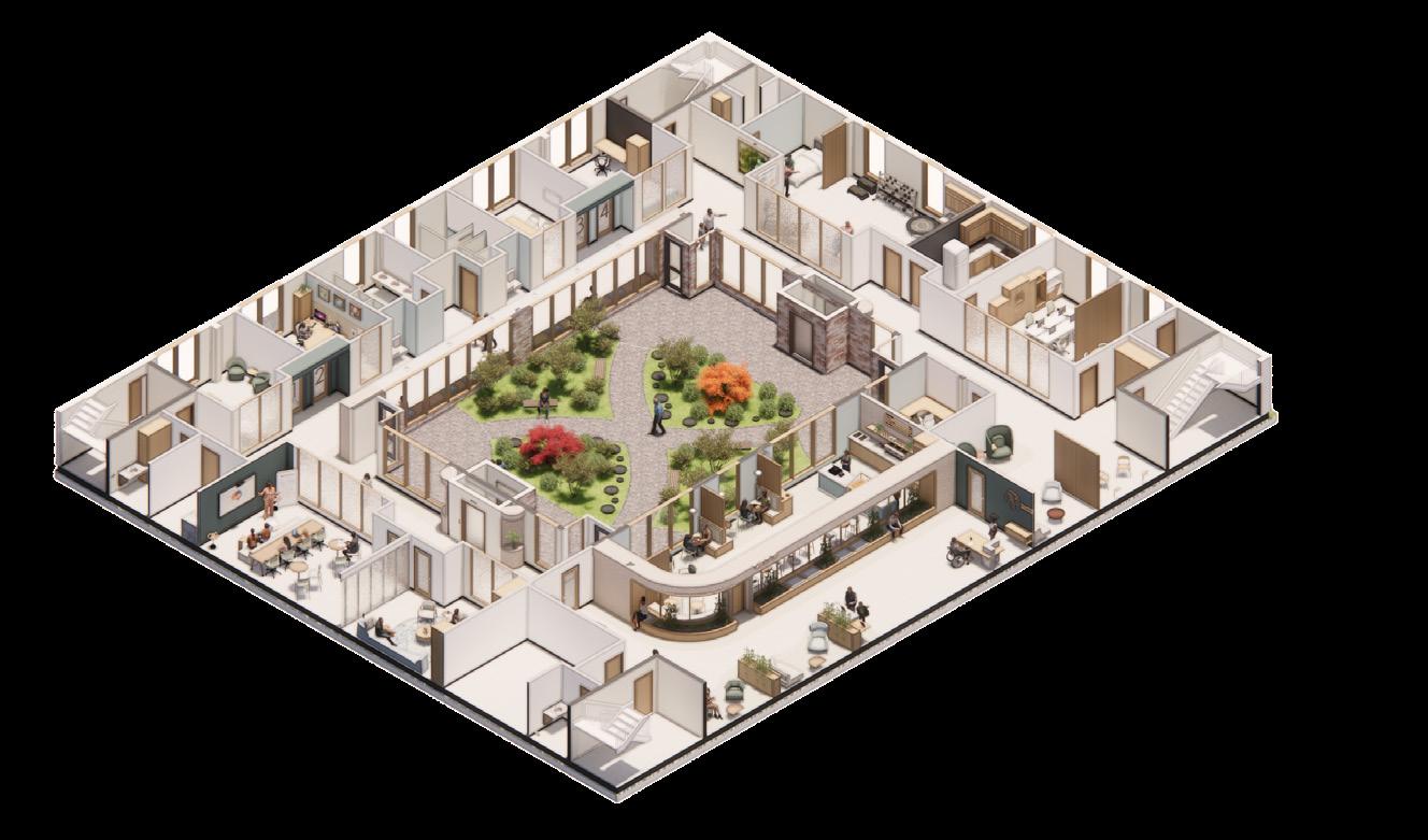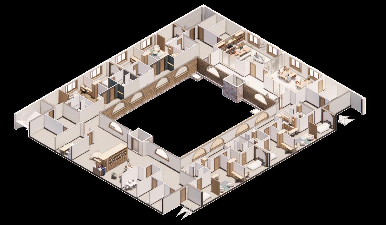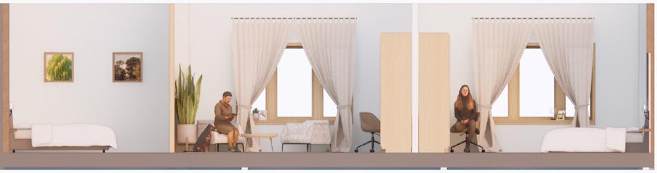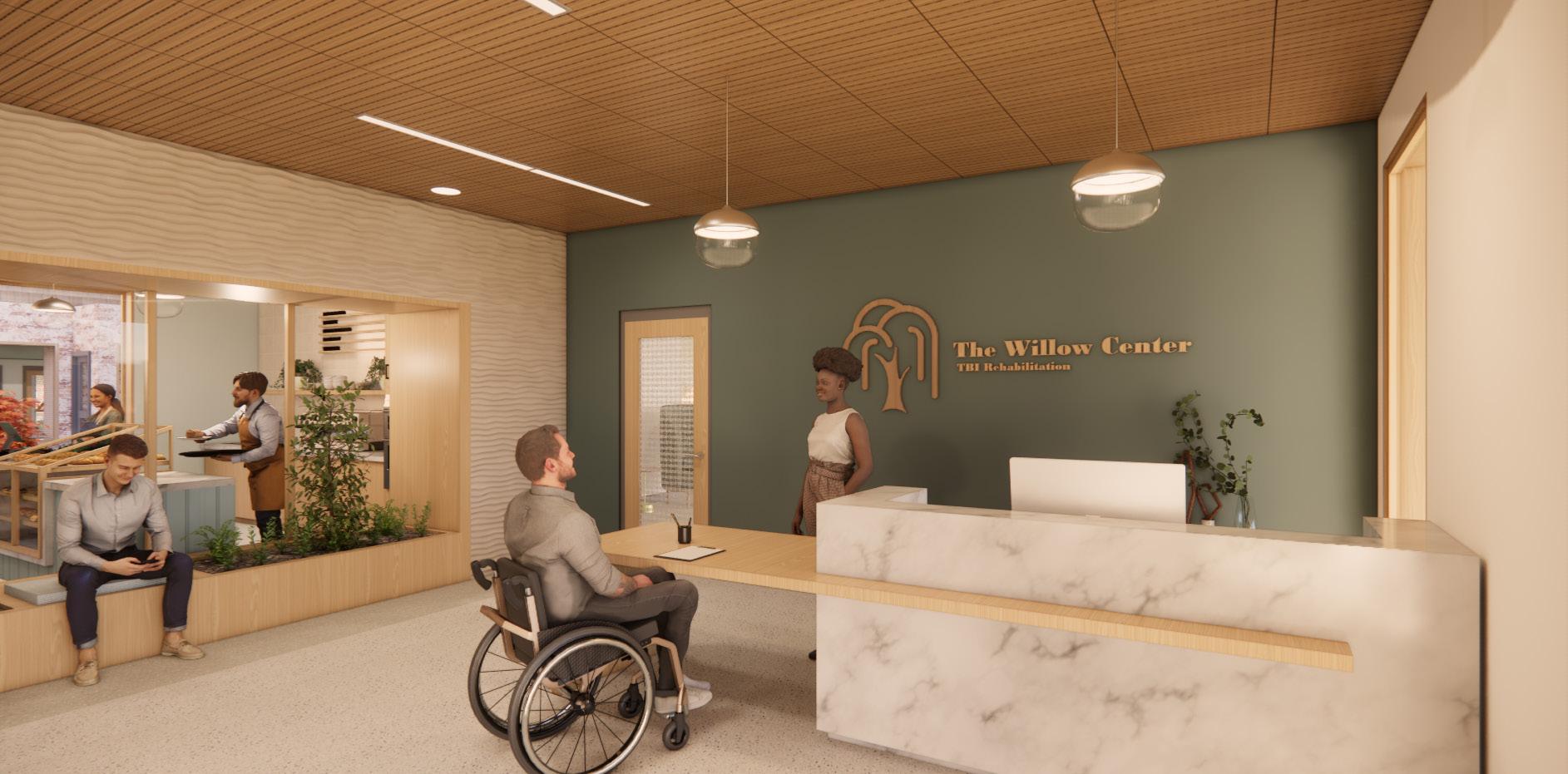 After a traumatic brain injury, patients experience a wide variety of symptoms including auditory, visual, and mobility sensitivities. Utilizing biophilic elements, person-centered design, and restoration theory, the Willow Rehabilitation Center provides interdisciplinary care and independent living opportunities for users navigating the transition between hospital care and home living.