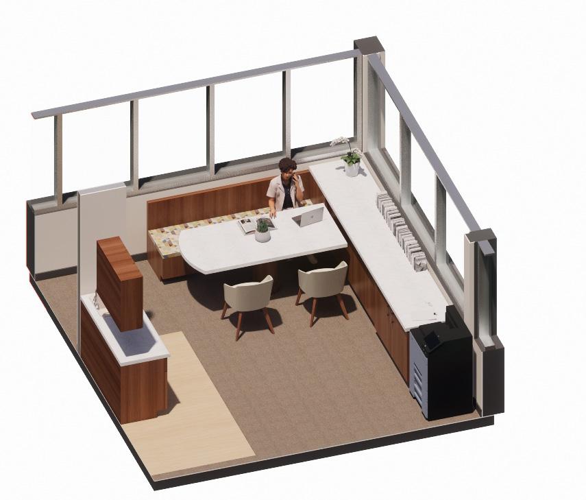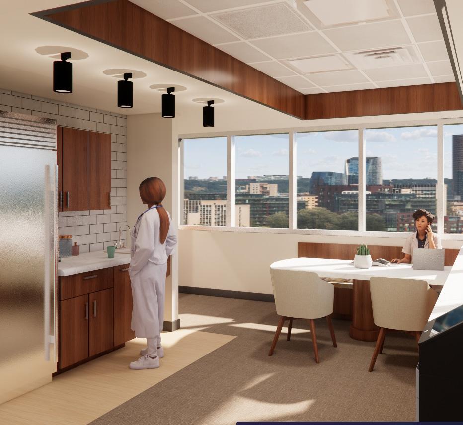 The workroom provides ample counter and table space for providers to eat, recharge, or work in a separate location. A half kitchen with a fridge, sink, and microwave promotes a sense of well-being in employees.