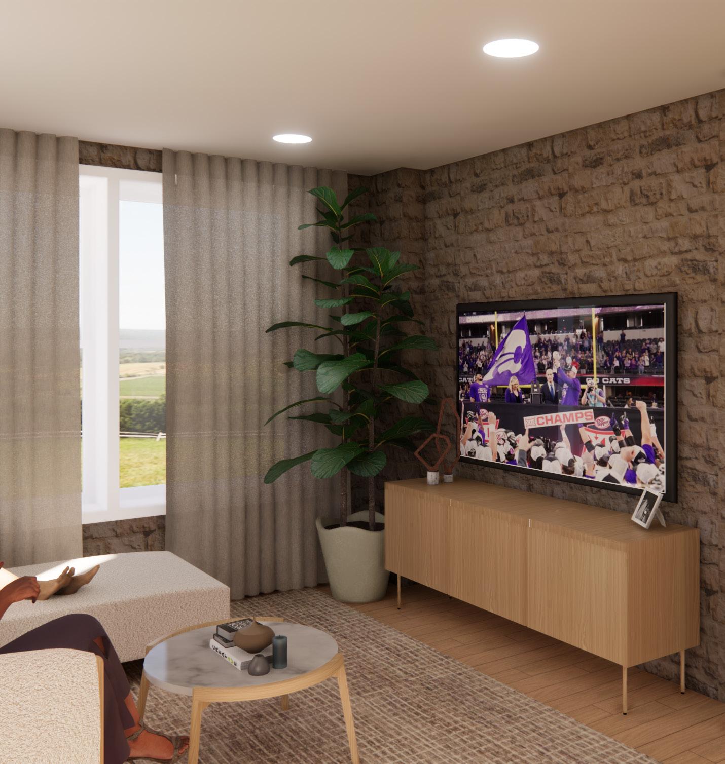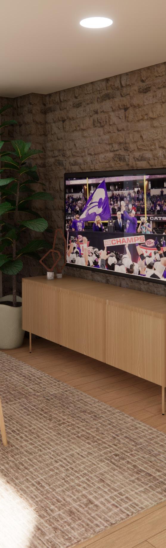 The informal living area is located to the left of the entry allowing for casual conversation and sport watching. A custom built-in greets house guests displaying the historical significance of the home with photos, artifacts, and documents sharing the story of the Marlatt family and the rich history of K-State.