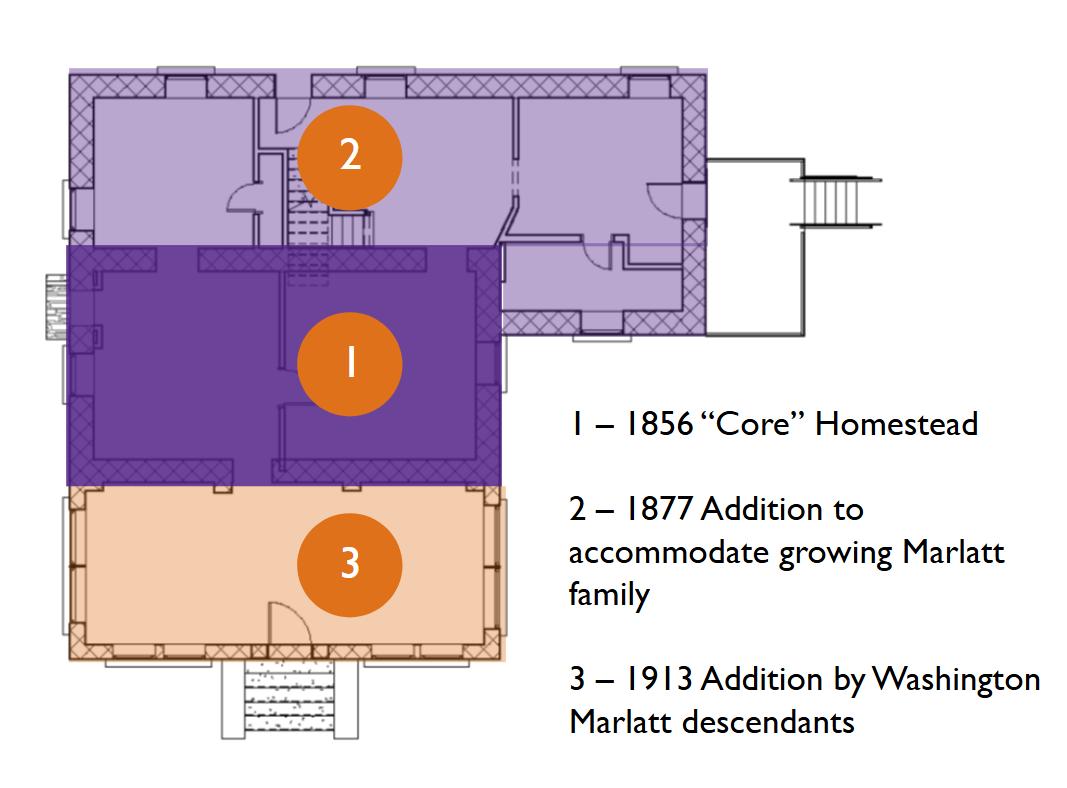 Listed on The State Register of Historic Kansas Places, the Marlatt Homestead was home to one of the most influential people in Kansas State history-- Washington Marlatt. The home, built in three distinct eras, was constructed with a direct viewline to Bluemont College, which would soon become Kansas State. Years later, the Bluemont College wood trusses were reused in the Marlatt barn highlighting the physical evolution of the rich history of Kansas State.