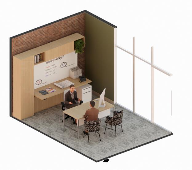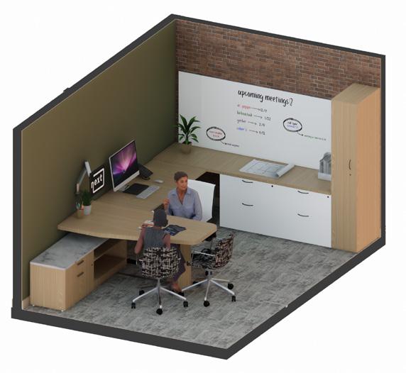 Private offices provide a space for individual work for team leads. Each office has ample workspace for large projects plus guest seating for private meetings. Height adjustable desks promote well-being. Open glass on two adjacent walls connects the office to the respective team.