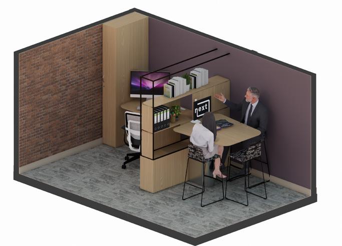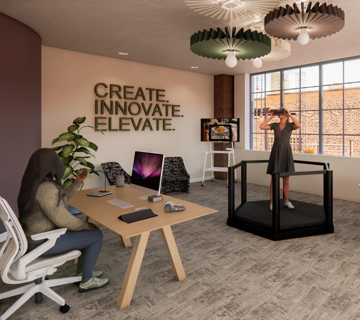 A virtual reality room allows clients to see future products in full scale, before they physically exists. Both employees and clients alike can utilize this space to enhance overall experience. The virtual reality space embodies technology objectives at the forefront of the values of NEXT.