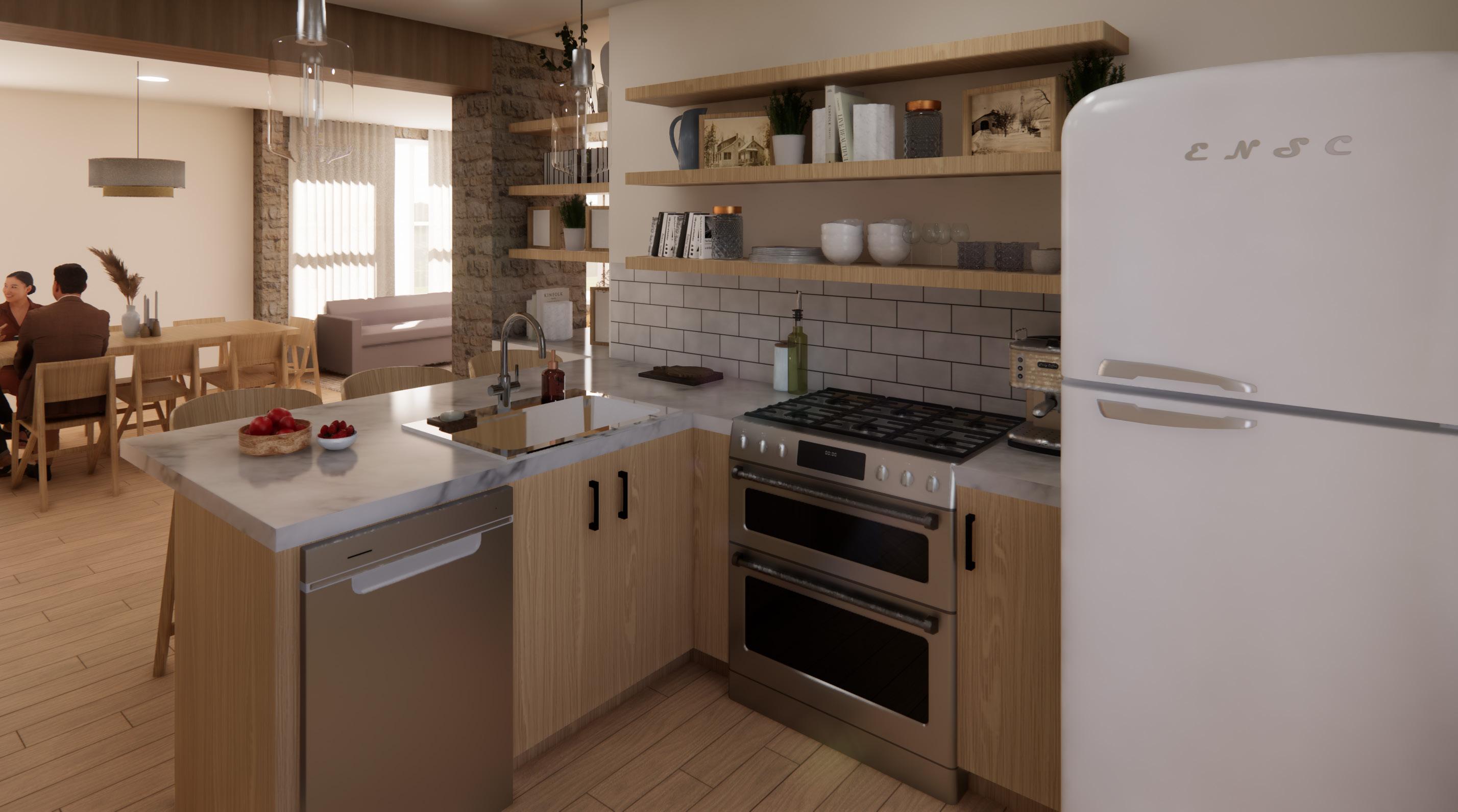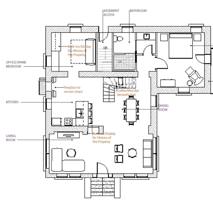 Relocating the kitchen and dining spaces back to the original 1865 ‘core’ of the home encourages collaboration and connection -- two things that the Marlatt family valued. Due to its B&B function, only a small kitchen is needed as extra storage and large appliances are unnecessary for short stays.