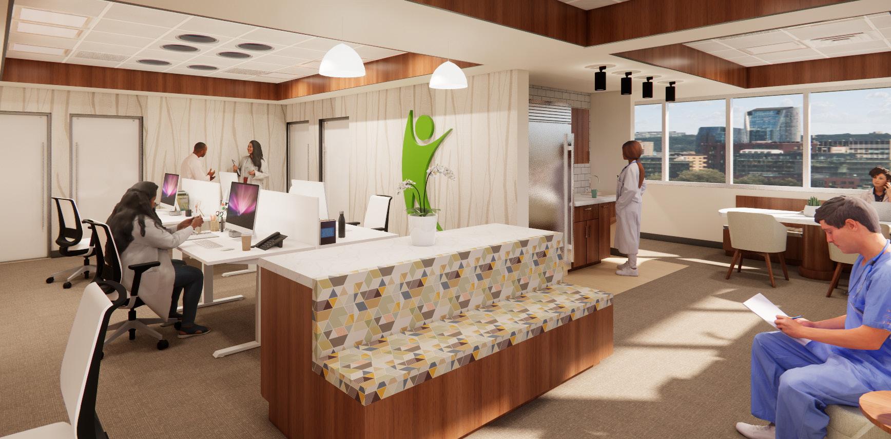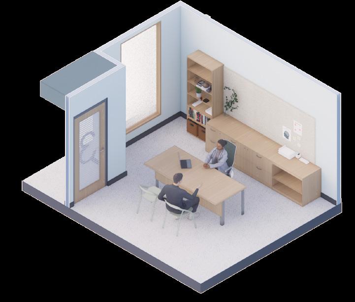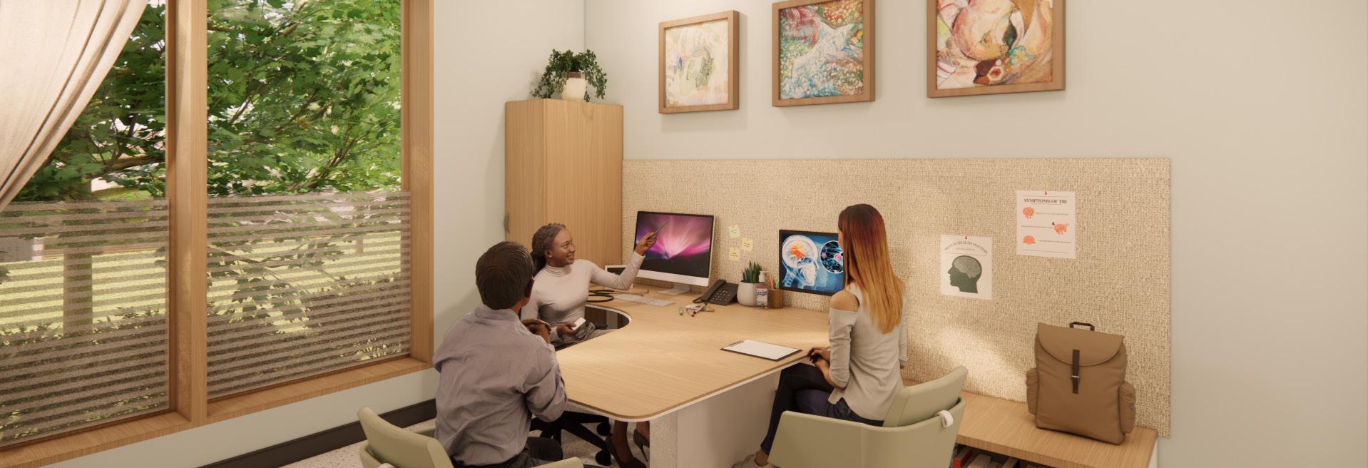The collaboration room provides a space for providers to focus and work with fellow care workers. Direct access to natural light, height adjustable desks, sociopetal seating arrangements, and lounge seating promote well-being in employees. Further, an efficient staff movement path reduces work-related injury.