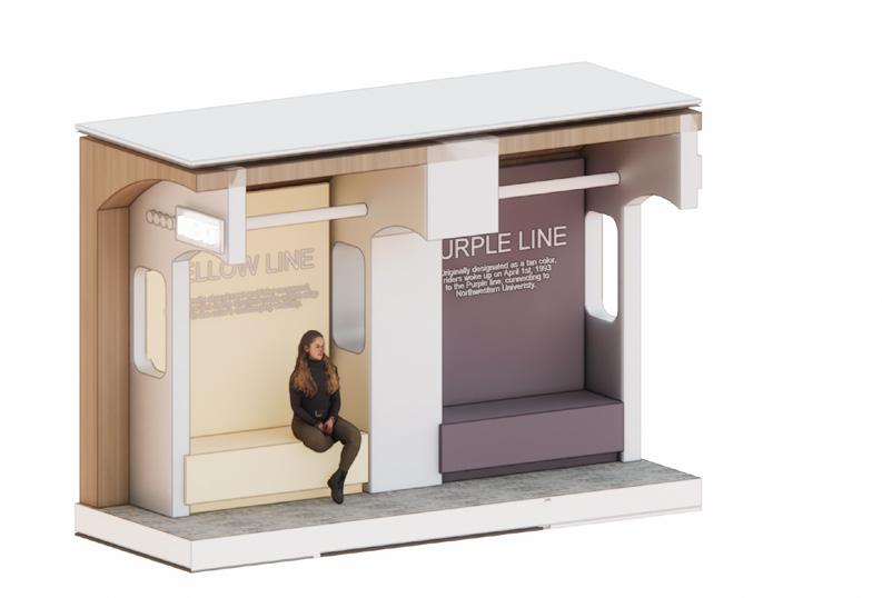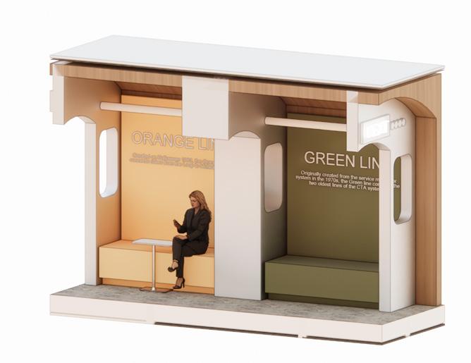 Custom bench ‘L’ seating is directly inspired by the form and shape of an ‘L’ train. Each built-in bench is color coded to match a color of the CTA system. Each line has a different story and development-- similar to the various departments at NEXT. This custom structure shares the history of such an influential part of the Chicago ecosystem.