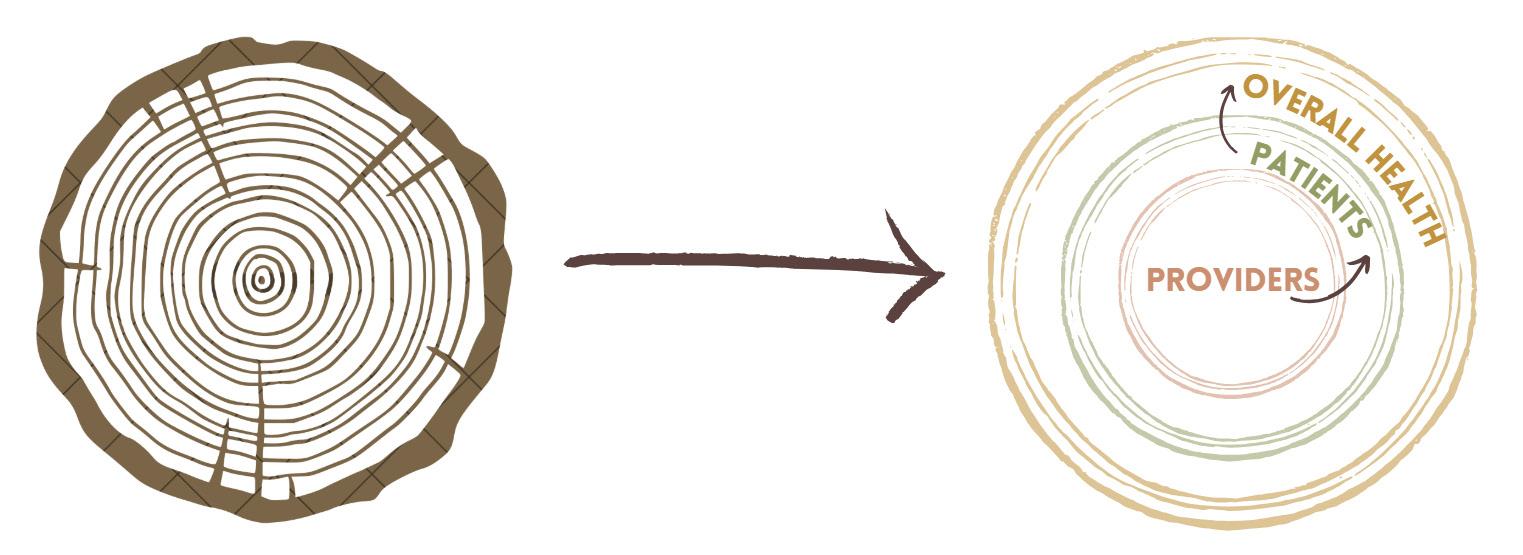 A physical snapshot of a life story. Without the initial, all subsequent rings would not be formed; without the center ring of care providers, patients would not be able to reach their health goals.