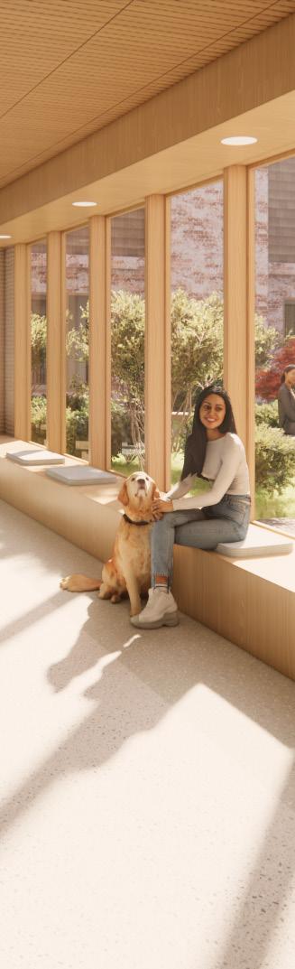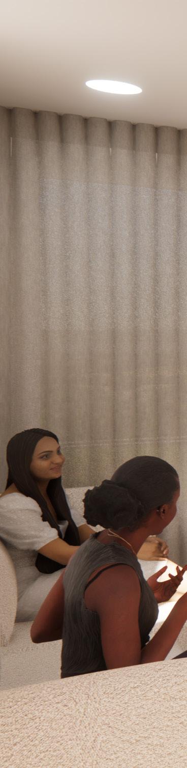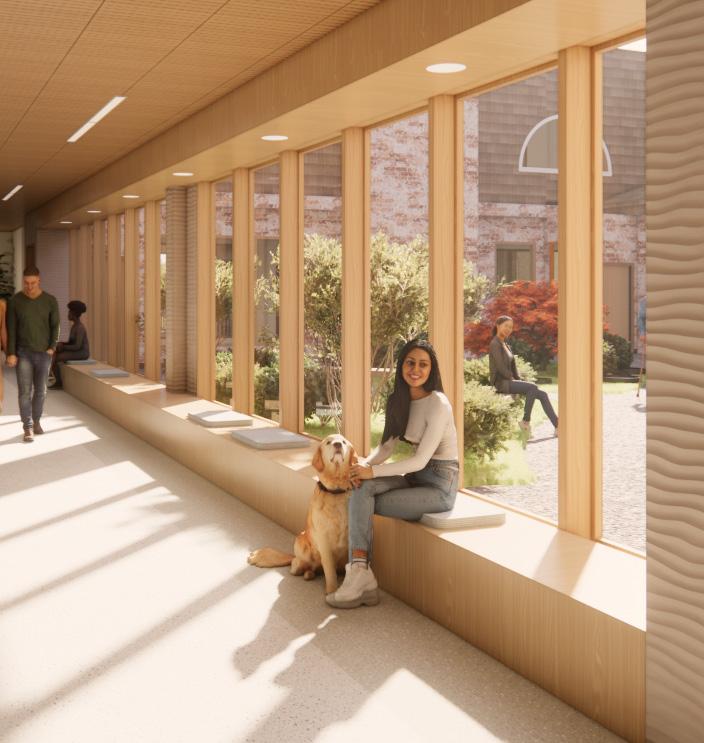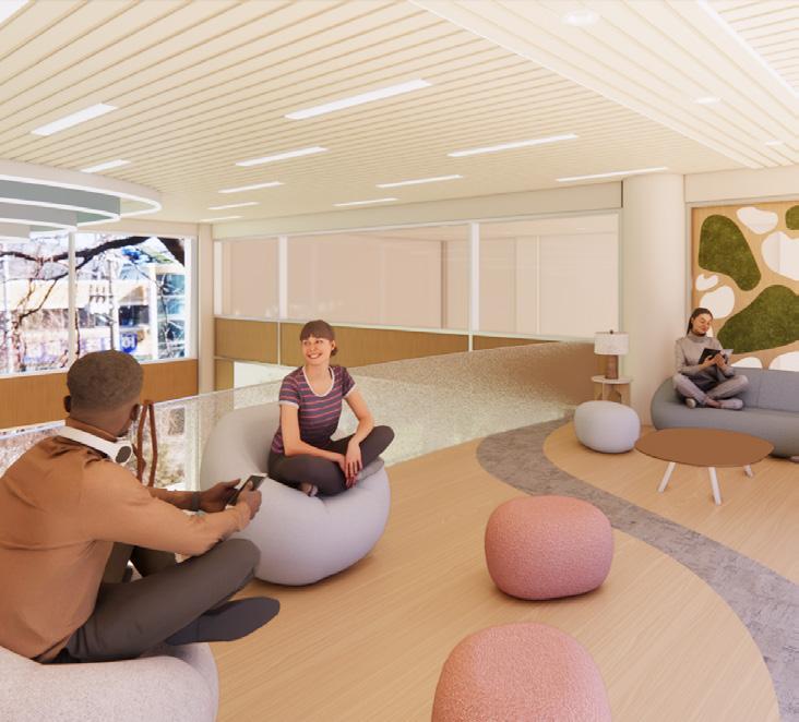 The entry creates an immediate sense of clarity and refuge, offering intuitive access to either digital checkin or the reception desk. Wood acoustic ceiling panels support sensory modulation by reducing auditory overstimulation, while a neutral palette and sociopetal arrangements reinforce comfort and safety.