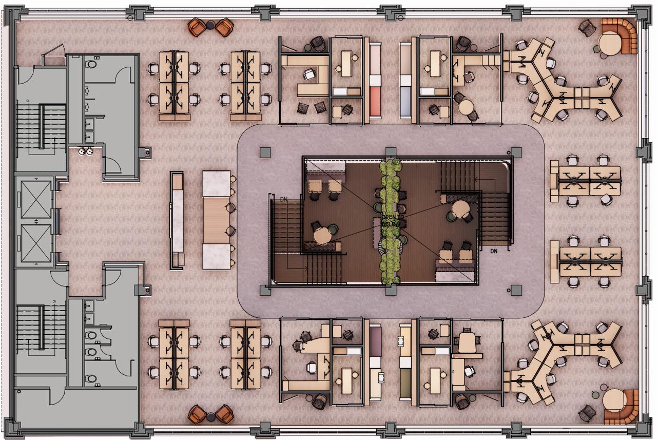 The work cafe is a place for individual or social time. A variety of seating styles promotes choice in users. Grounded by the double volume and skylight, this space serves as the center of the loop-- a place where all individual lines and employees intersect.