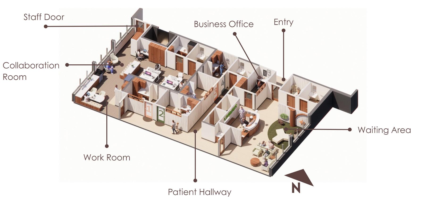 Organized around the on-stage / off-stage model, Lymelight provides efficient circulation for both patients and providers. The L-shape exam room formation surrounds the collaboration space -- limiting large circulation paths for providers, ultimately reducing the chance of work-related injury.