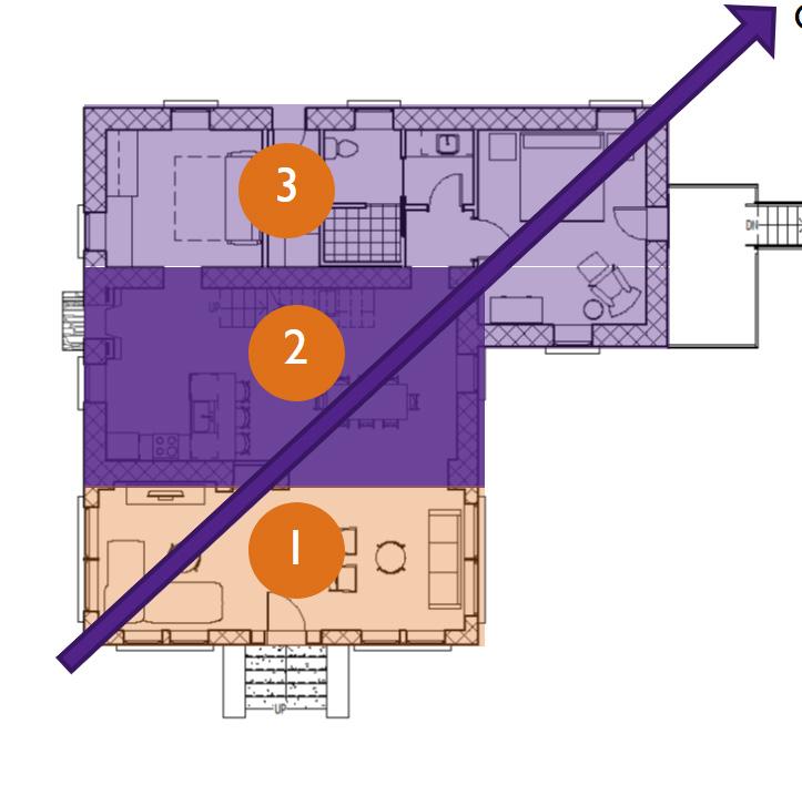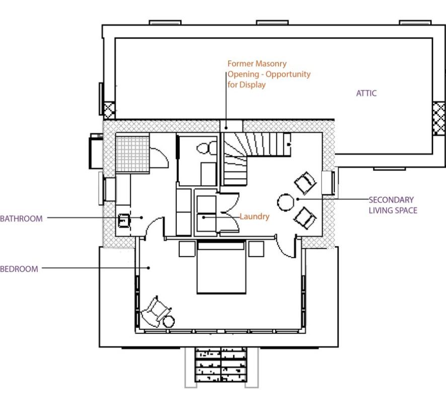 The space plan was guided by the construction eras of the home. Due to its location on the corner of two busy streets, the home was designed with a privacy gradient with the most public areas being on the exposed corners of the home. Designed with the user in mind, each bedroom has its own living area zone.