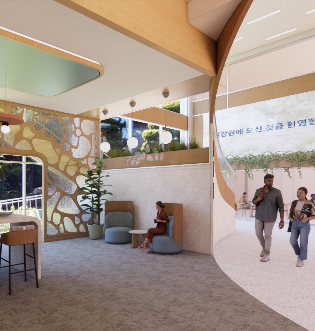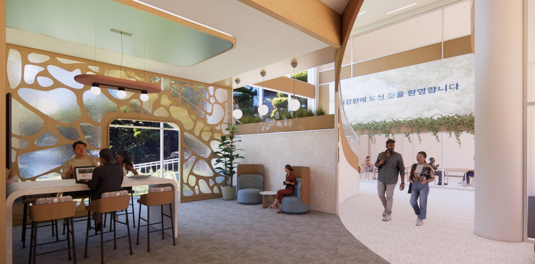 Illgangwon, a campus building in the College of Engineering, is transformed into a dynamic environment that supports both community interaction and quiet individual retreat. By incorporating biophilia, user-choice strategies, and thoughtful technology integration, the lobby transforms into an active and engaging hub for students and faculty.