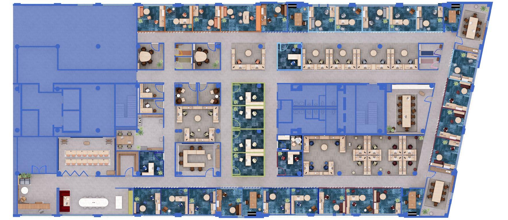 Per client request , private offices line the window perimeter, with both private offices and open workstations organized by practice area to align teams around client demands.