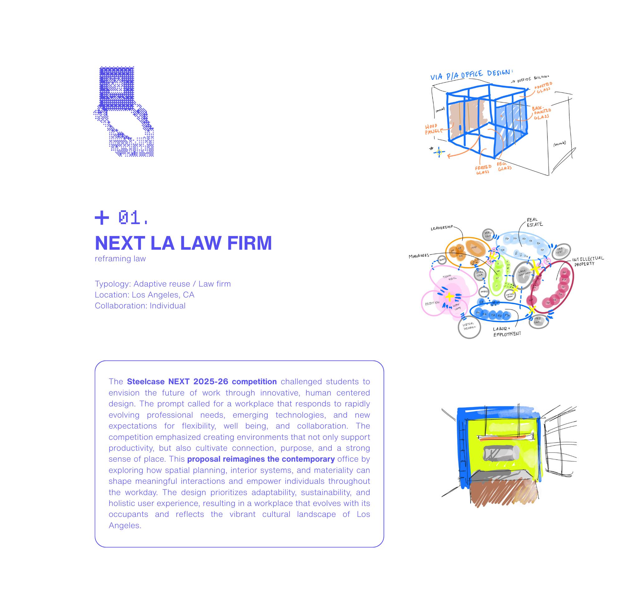 xt Frame uses framing as a design act to challenge al law office norms by redefining innovation aesthetics, ng office related health issues, and reconsidering what means within a legal workplace. Through intentional raming and bold use of color, the project rejects muted y in favor of visible innovation, suppor ts employee well