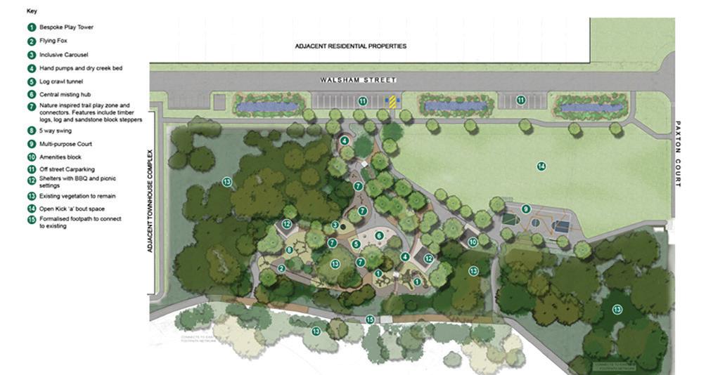 Community consultation has shaped the park‘s features, which will include an all-ages playground, picnic facilities, a multi-sports court, open space, amenities, and additional parking. The park will also feature shaded areas and nature play elements aimed at encouraging children to explore the outdoors.
