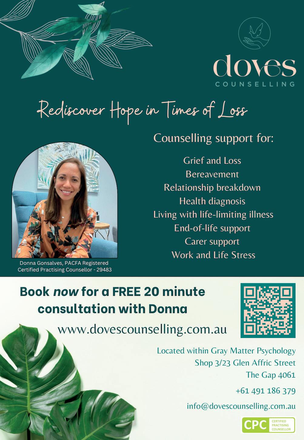 Contact Donna at Doves Counselling on 0491 186 379 to book your FREE 20 minute consultation. In-person and Online telehealth sessions available. More information is available on www.dovescounselling.com.au