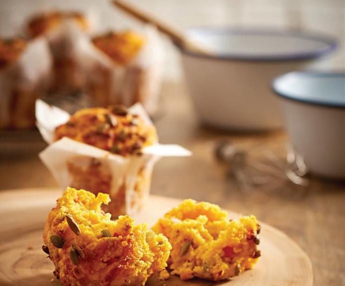 COMBINE the flours, polenta, capsicum, thyme and half the pepitas in a large bowl, making a well in the centre.