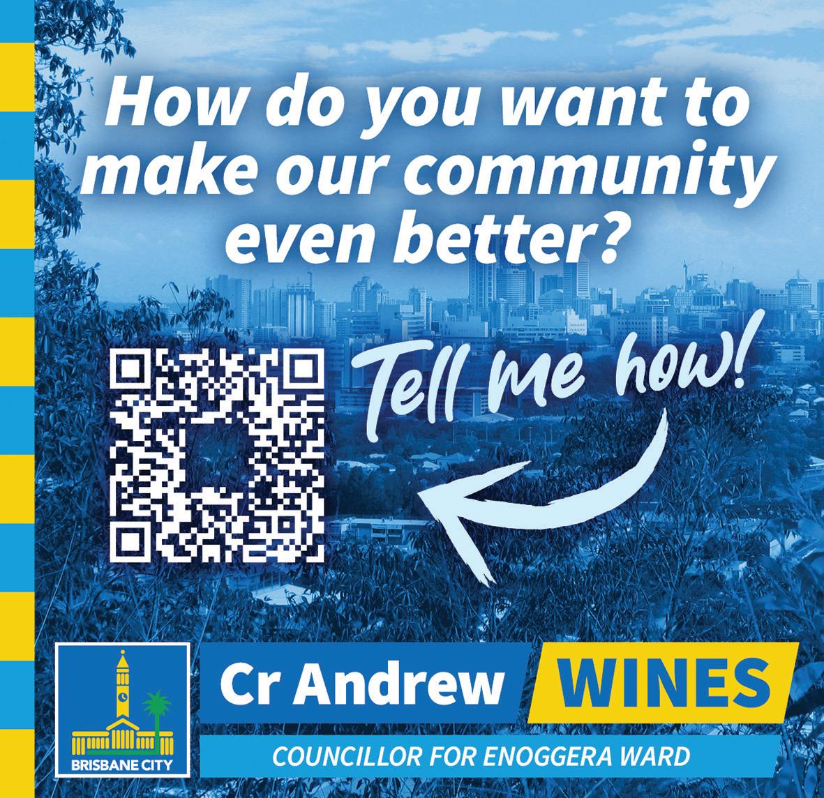 I have always been committed to improving our community’s transport, drainage, and parkland. You can find out more about local projects I have delivered on my website andrewwines. com.