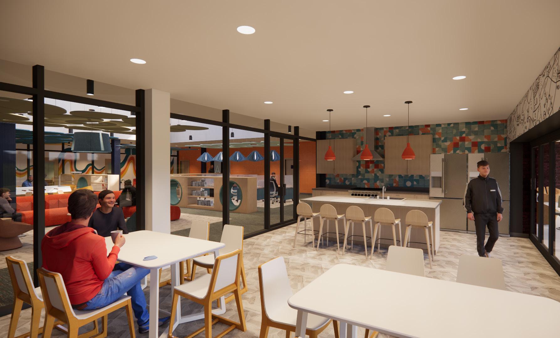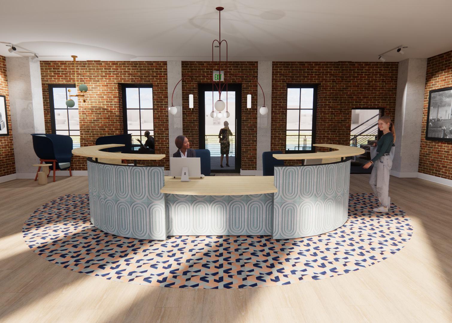 The second level houses a salon, retail spaces, lounge, library, and single and double occupancy rooms.