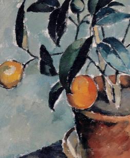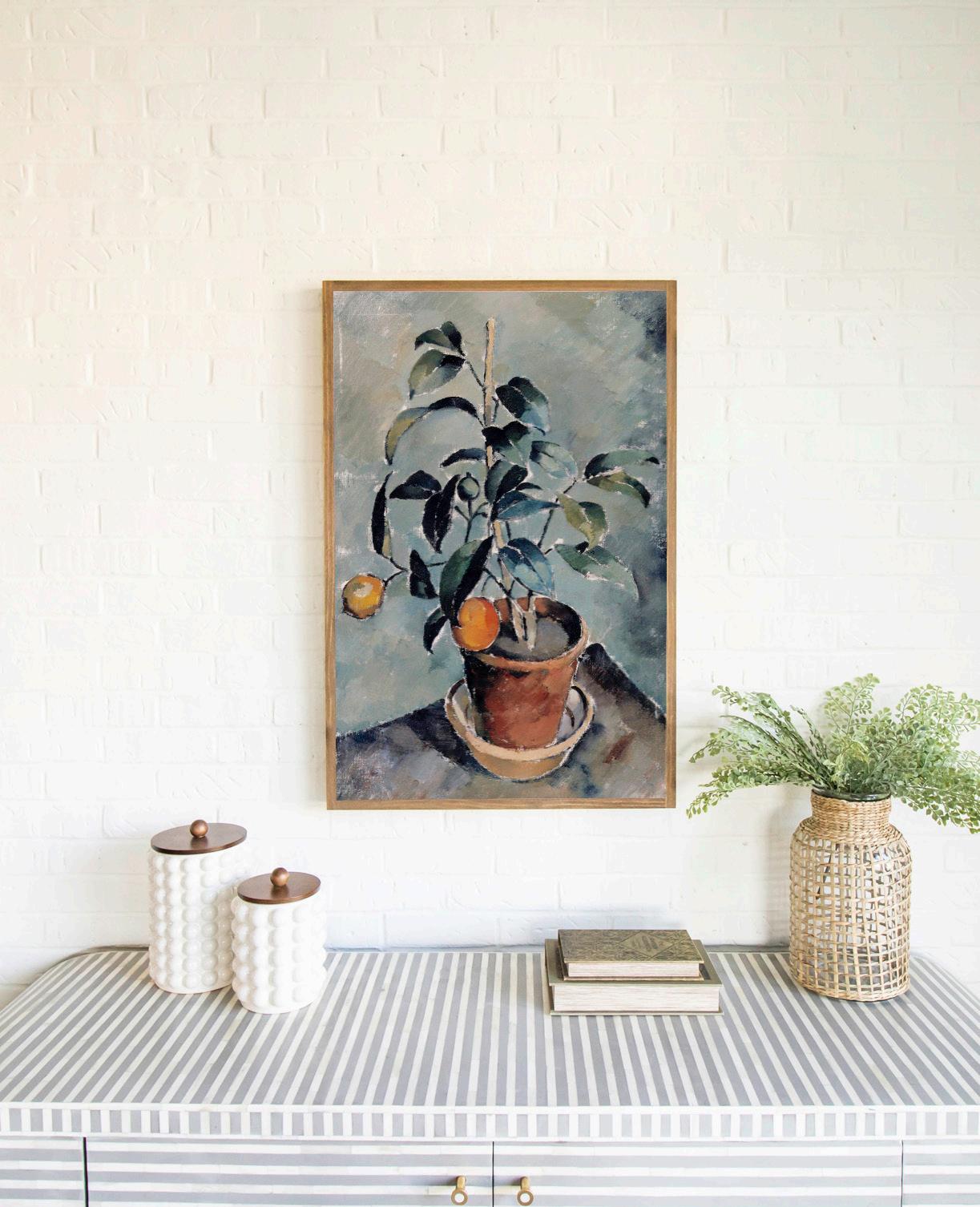 A sweet orange plant in a terracotta pot makes up this vintage art piece. Shades of blue, green, and orange can be seen.