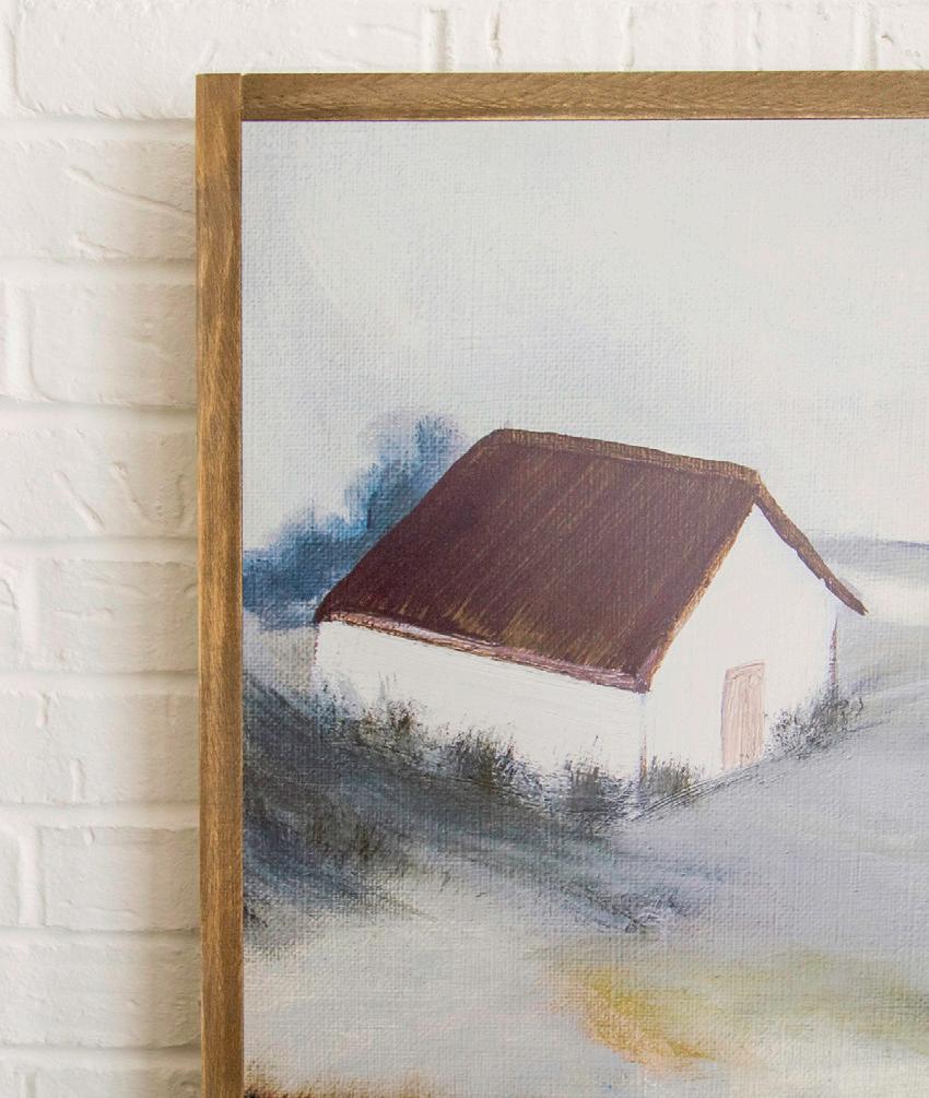 A serene country-side landscape featuring the sweetest white cottage makes A Calming Place a beautiful choice for any space in your home. Painted by artist Terrah Ray, this piece is made up of hues of green, gold, blue, brown, and cream.