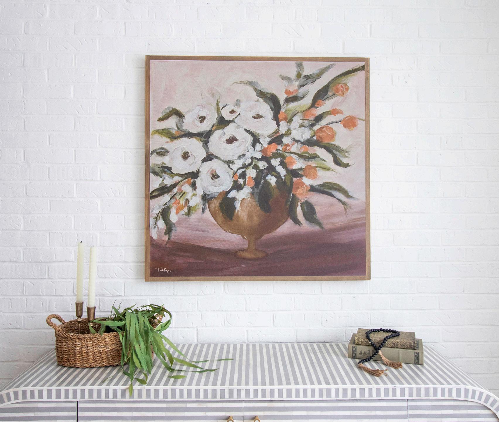 Garden Harvest was painted exclusively for Joyfully Said by artist Terrah Ray. Hues of gold, plum, coral, blush, and brown create a rich, vintage-inspired floral that add beauty and joy to your home all year round.