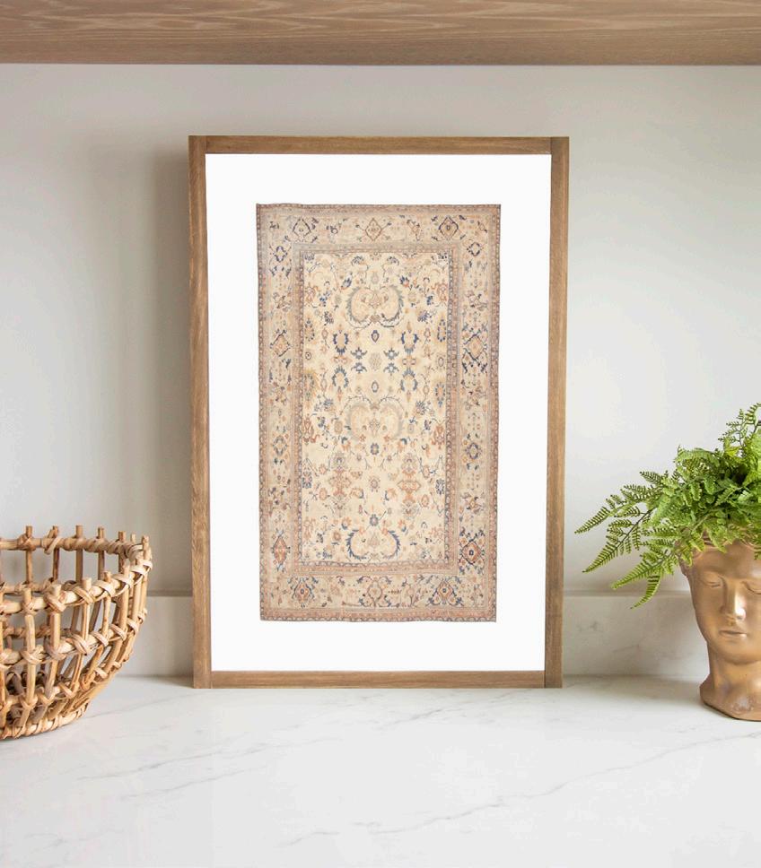 Bring the look of vintage tapestry into your space with our Matted Vintage Rug wall art. The colors in this piece include tan, cream, blues, and rust.