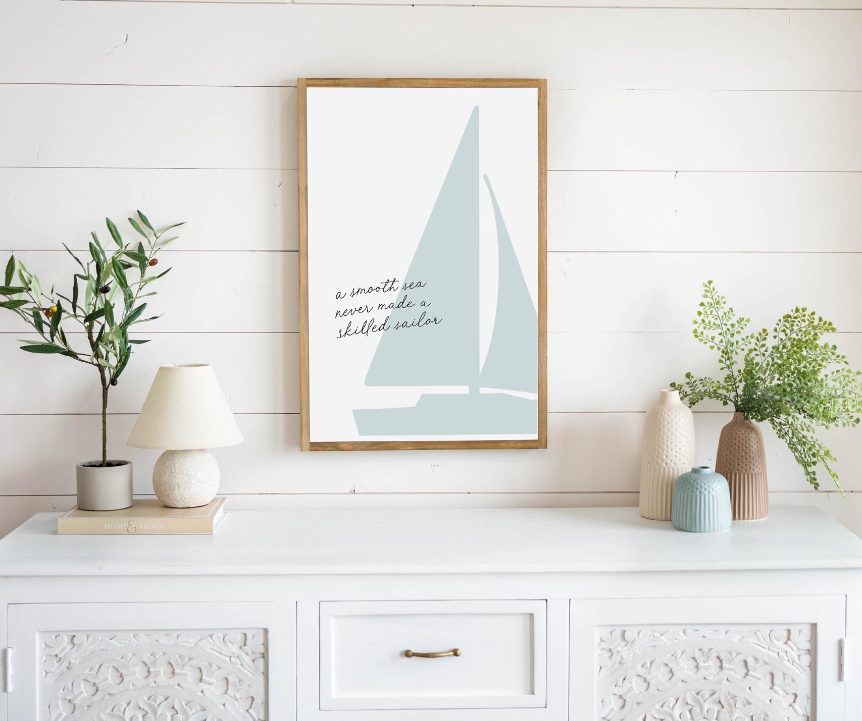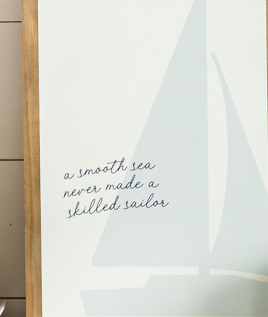 This piece offers a daily reminder to find purpose in the rough waters of life. A sea salt colored sailboat provides a light, airy nautical feel to your space.