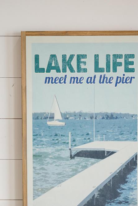 A nod to days gone by, the Lake Life Vintage Poster is the perfect way to add lakeside nostalgia to your lake front home. Shades of blue, green, and white are the main colors found in this retro poster-style piece.