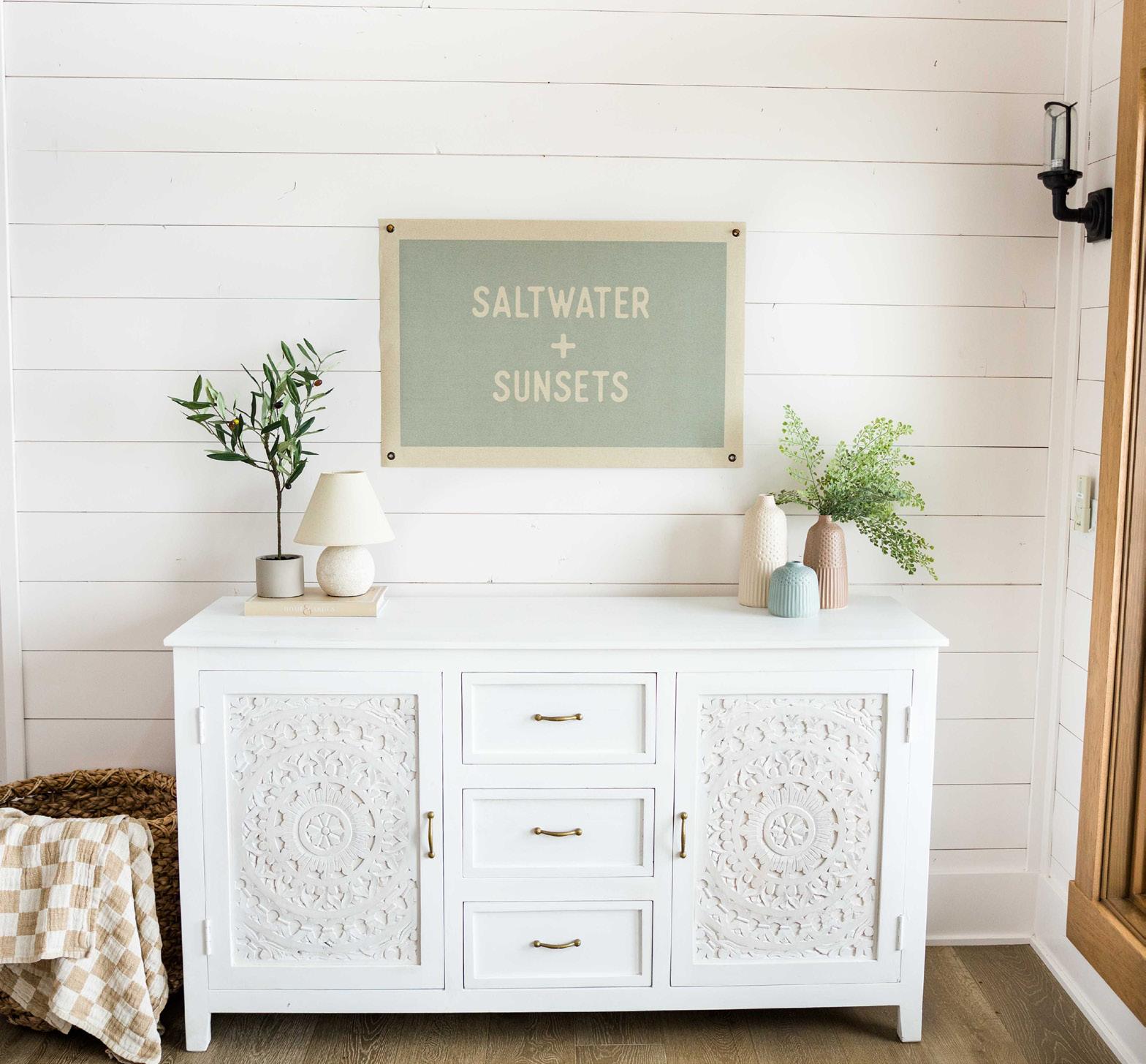 We are loving the coastal vibe of the Saltwater + Sunsets canvas banner! Featuring a sea salt colored background with a natural colored border and lettering, this banner adds a just enough personality and fresh style to any beach lover’s space.