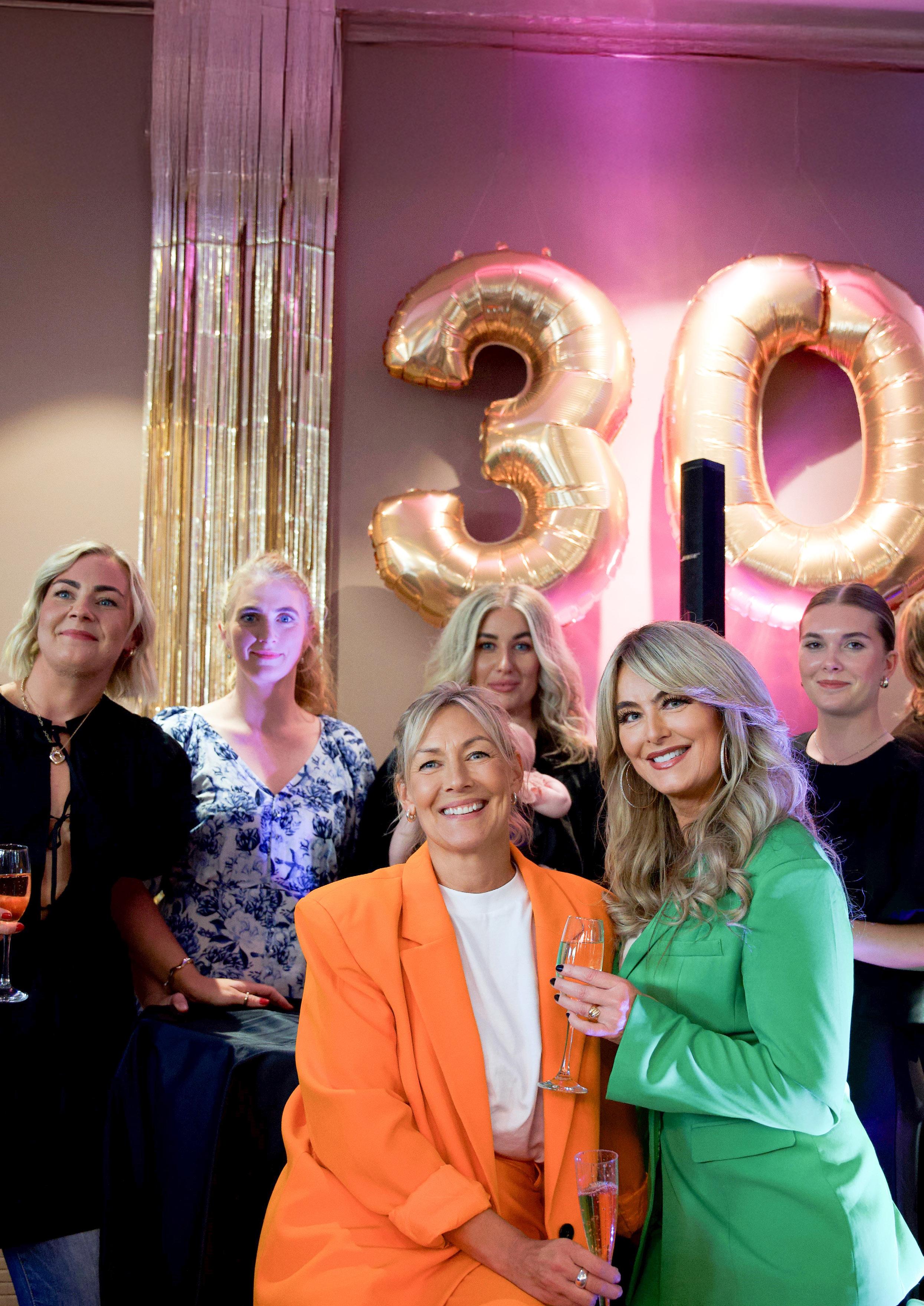 Cia Ronach och Anna-Karin Gustafsson, grundare av Hud & Hår Kompaniet, skålar med gästerna under företagets 30-årsjubileum.