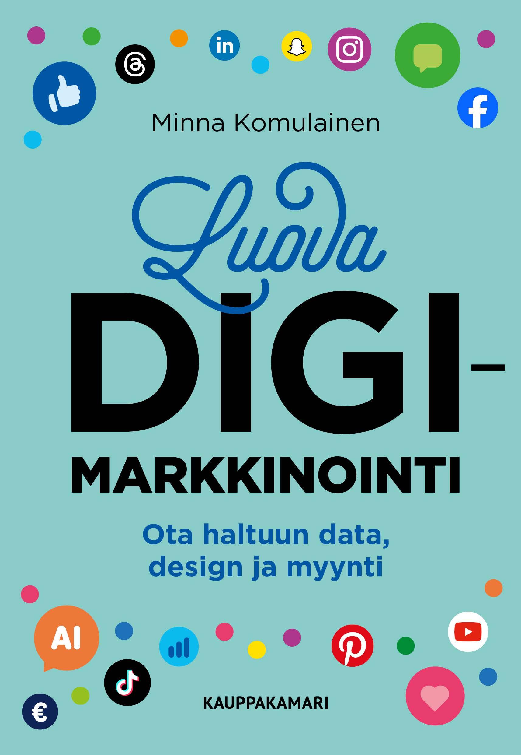 Luova digimarkkinointi -kirja tarjoaa työvälineet ja askelmerkit moniin markkinointia askarruttaviin kysymyksiin – oli sitten kyseessä digimarkkinointistrategian luominen kuin käytännön tekeminen. Kirjan eri luvuista löydät keinot, miten soveltaa digimarkkinoinnin tuoreimpia uutuuksia, tekoälyn mahdollisuuksia, data-analytiikkaa ja kehittämistä omaan työhön. Voit hyödyntää kirjaa käsikirjana ja hypätä suoraan itsellesi ajankohtaisimpiin lukuihin. Parhaan osaamisen kokonaisuudesta saat, kun seuraat kirjan punaista lankaa etenemällä johdonmukaisesti: markkinan tunnistamisesta asiakasymmärrykseen ja markkinointistrategian luomiseen, somekanaviin sekä tulosten seurantaan.