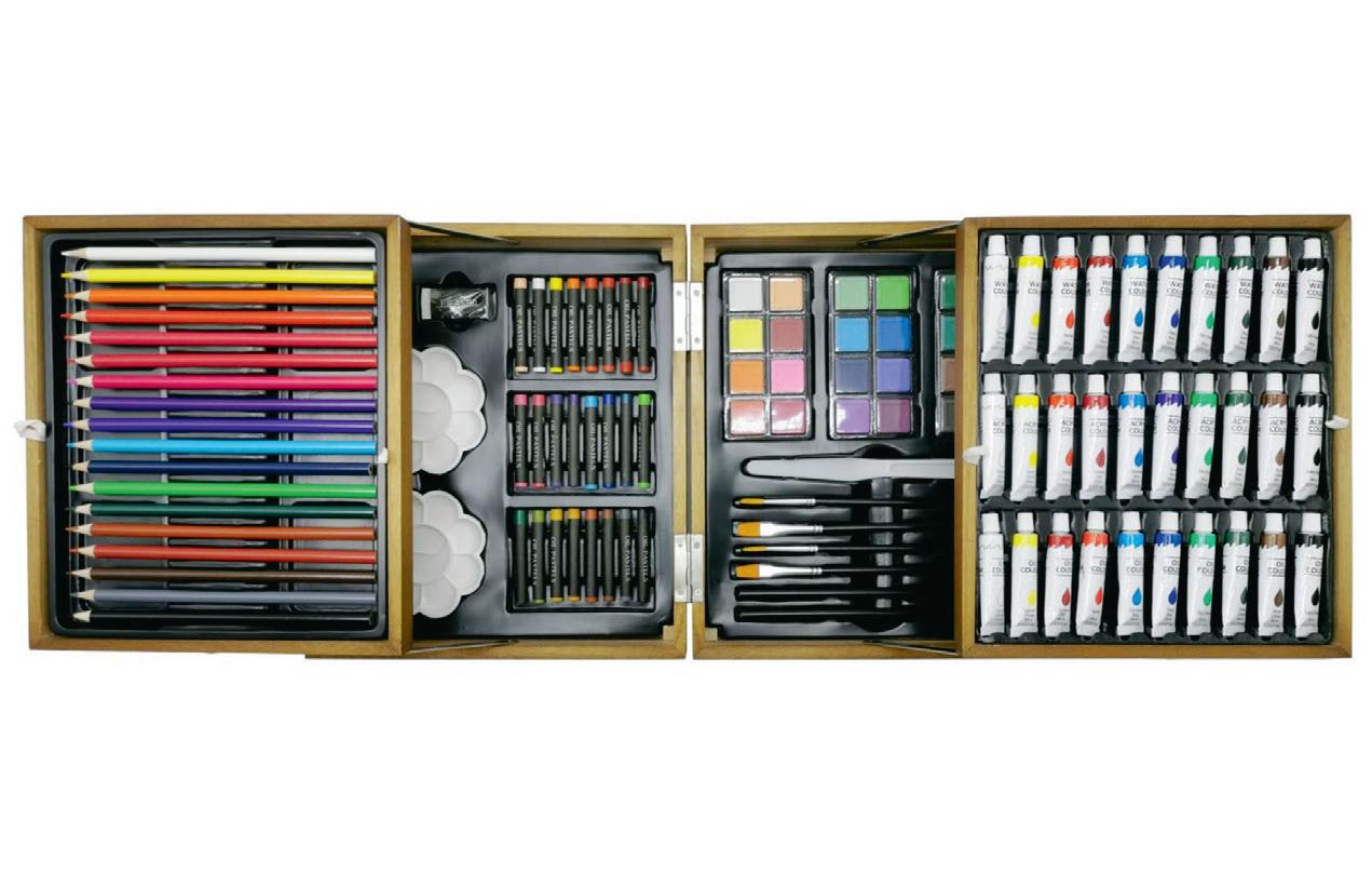 (6 ml), 10 x akryylimaalia (6 ml), 18 x värikynää, 24 x öljypastelli liitua, 2 x väripalettia, 1 x teroitin, 1 x vinyylipyyhekumi, 24 x vesivärinappia, 4 x sivellintä ja 2 x lyijykynää .