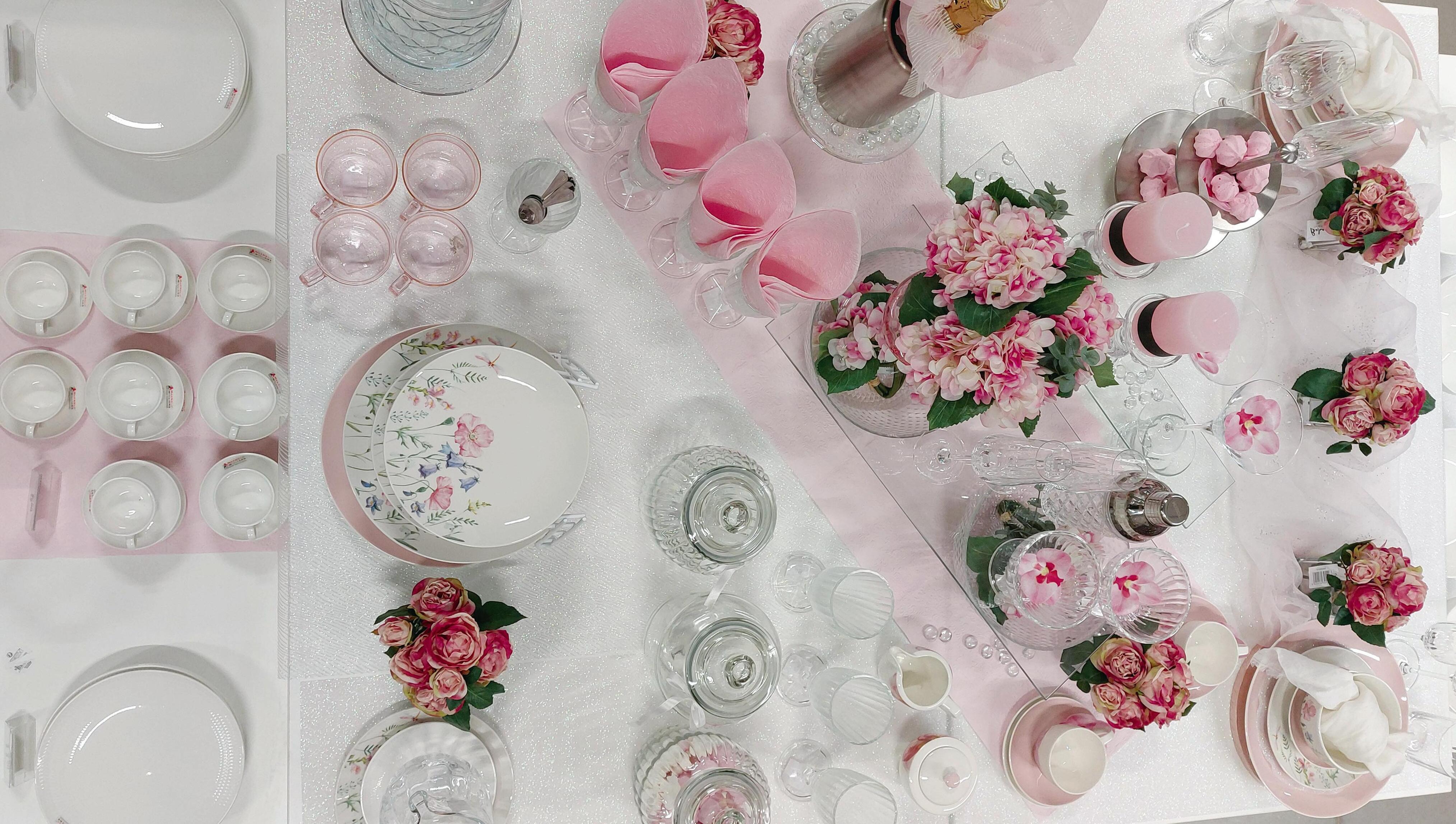 Lempeää naisellisuutta ylistävässä kattauksessa Lahden Kärkkäisen talousosaston myyjä Kirsi Pyykönen yhdistää kevään pastelliykköstä eli vaaleanpunaista sekä valkoista, ja kuin taikasauvalla sipaisee mukaan ripauksen säihkettä.
