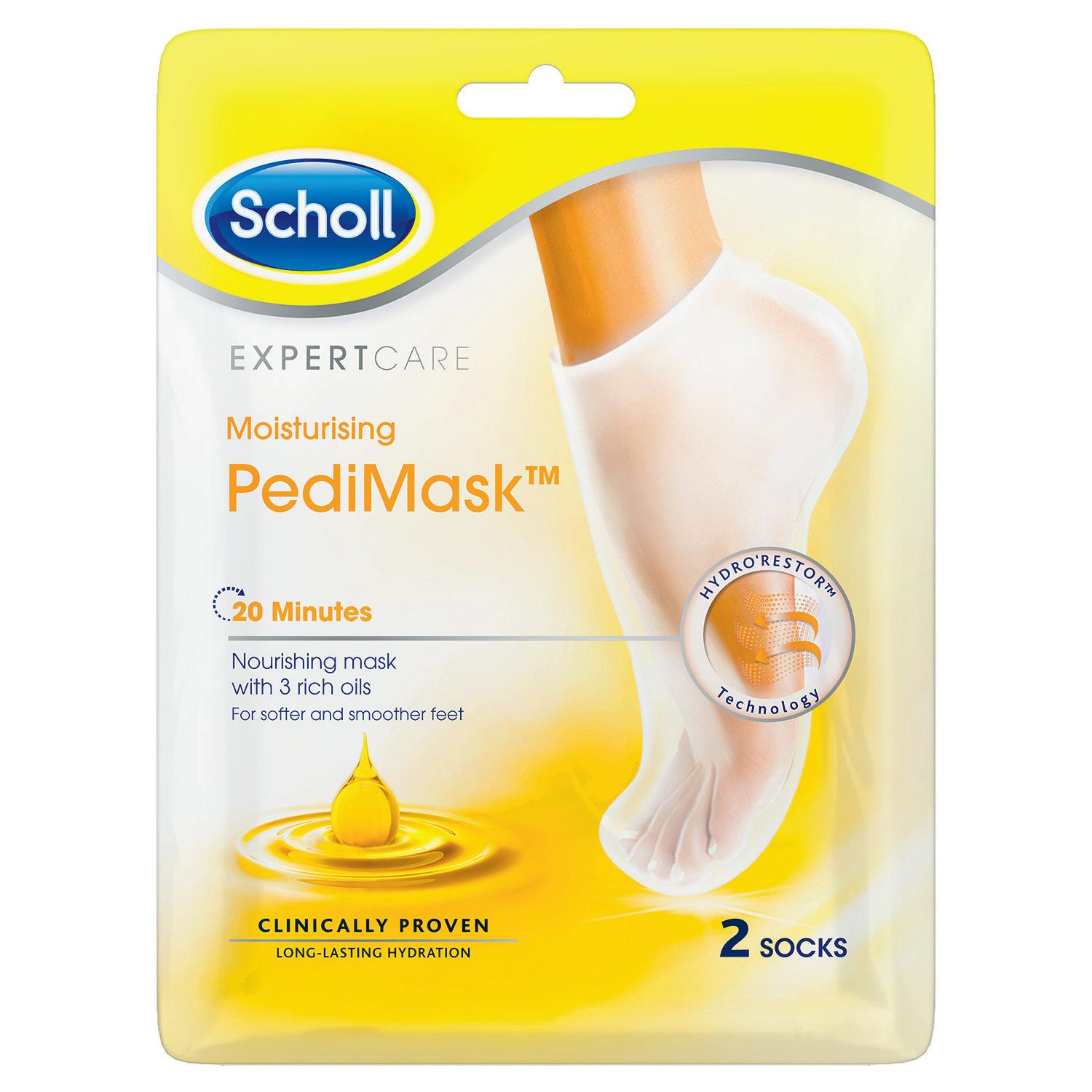 – Sukanmuotoisia Schollin kosteuttavia naamiota on helppo käyttää, ne eivät jätä tahmaista tuntua jalkoihin. Naamiosukkia pidetään jaloissa parinkymmenen minuutin ajan.