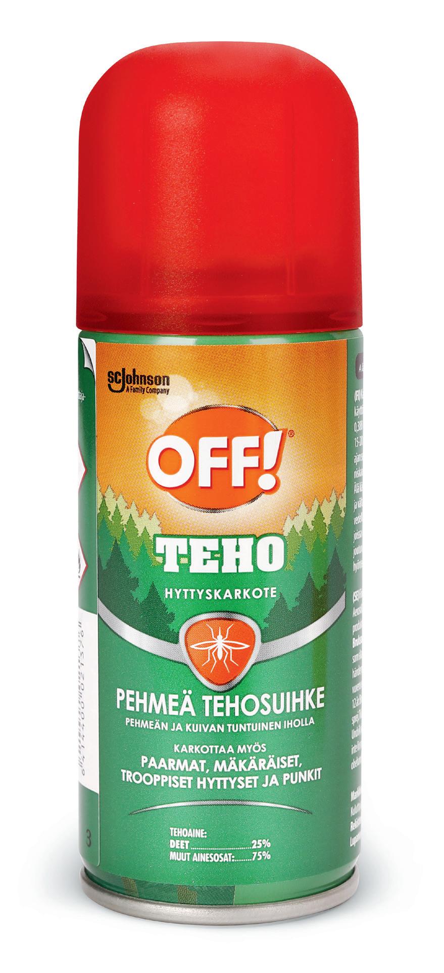 – OFF! Pehmeä tehosuihkessa tehoaineena toimiva DEET (dietyyli-m-toluamidi) on tehokkain, tutkituin ja eniten käytetty hyönteiskarkote maailmassa, Kivimäki kertoo.