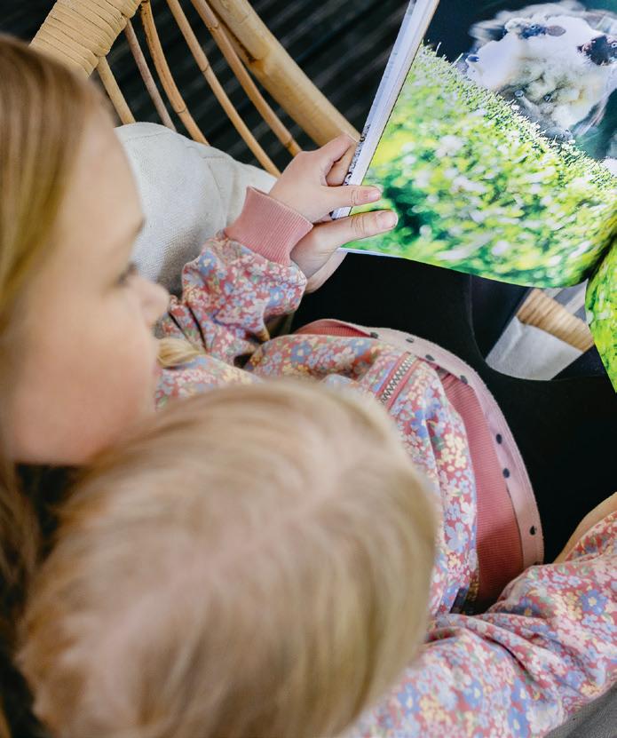 Jenni Rättyän tyttäret, 9-vuotias Iina ja 3-vuotias Ninni katselevat innokkaina äidin ottamia valokuvia Hurraa Huiskankorpi! Rupulivuoren ympäri -kirjasta, myös tarina innostaa.