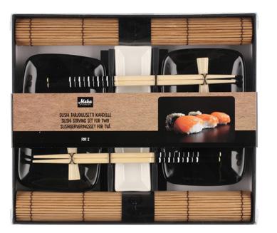 puikkotelineet ja soijakupit sekä bambusta valmistetut syömäpuikot ja tabletit. Setti on pakattu nättiin lahjalaatikkoon.