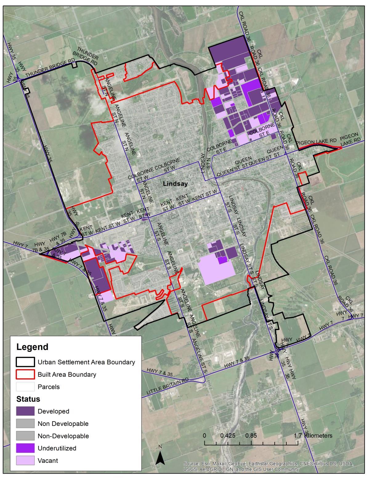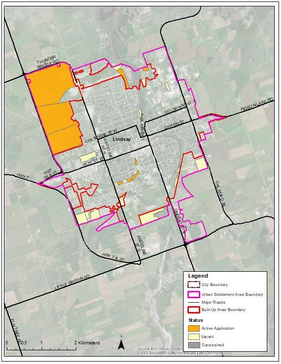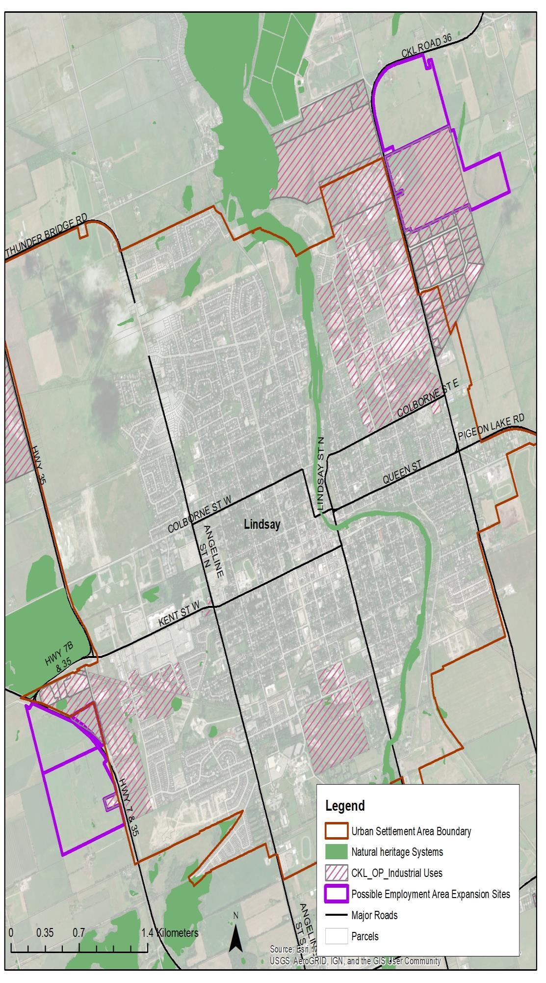 As determined through a set of evaluation criteria development as part of this G.M.S., two prospective areas for a new Employment Area in Lindsay have been identified and recommended for further assessment. These sites include areas located east of the CKL Road 36 in the Northeastern end of the settlement area, and lands west of Highway 7 and 35 (south of Kent Street).