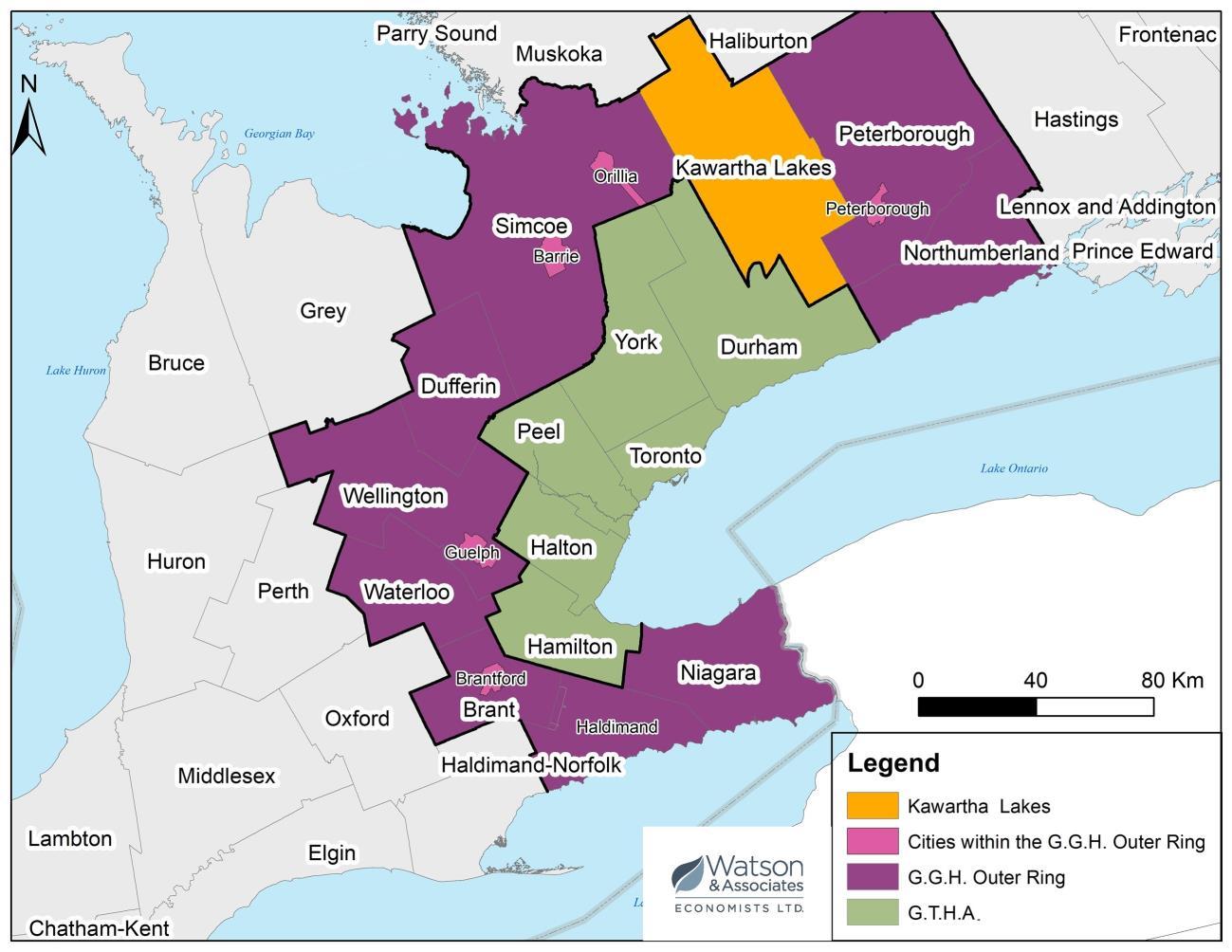 As discussed in Chapters 3 and 4, herein, the City of Kawartha Lakes is well positioned to continue to attract and accommodate steady population and employment growth over the next three decades. A key driver of this long-term population and employment growth potential is the City’s geographic proximity to the Greater Toronto Hamilton Area (G.T.H.A.). The G.T.H.A. and surrounding municipalities within the Greater Golden Horseshoe (G.G.H.) Outer Ring represents a key center of economic activity in Ontario as well as in Canada (refer to Figure ES-1). This broad region of Ontario also represents a large portion of the commuter-shed for the City of Kawartha Lakes. Potential employment opportunities within the City and its surrounding commuter-shed are a key factor driving net migration and housing growth in the City and the broader region