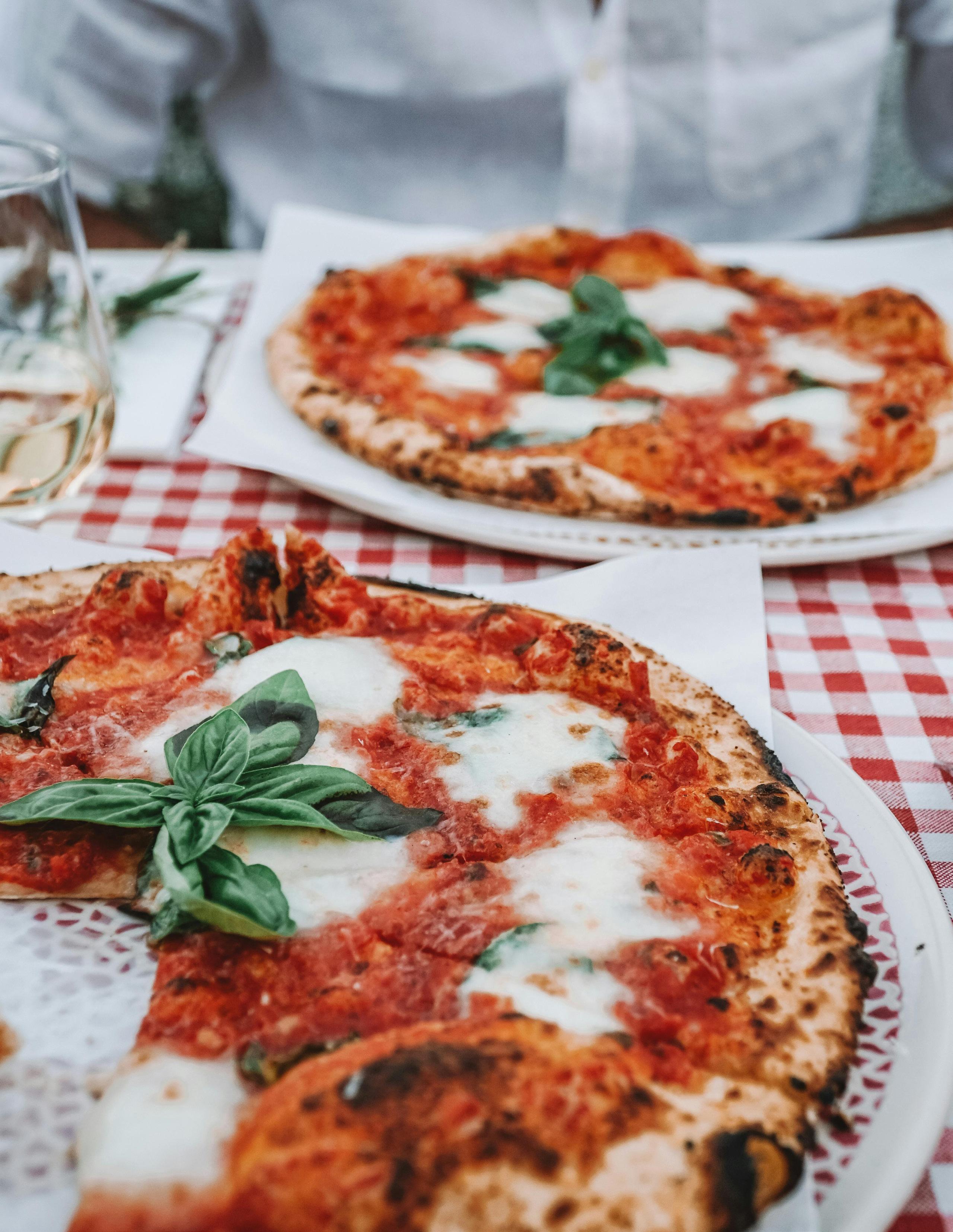 Two pizzas with mozzarella, basil, and tomato sauce on a red and white checkered tablecloth. A glass of wine and a person's torso are visible in the background. Photo courtesy of Pexels by Esrageziyor via a Free Pexels License.