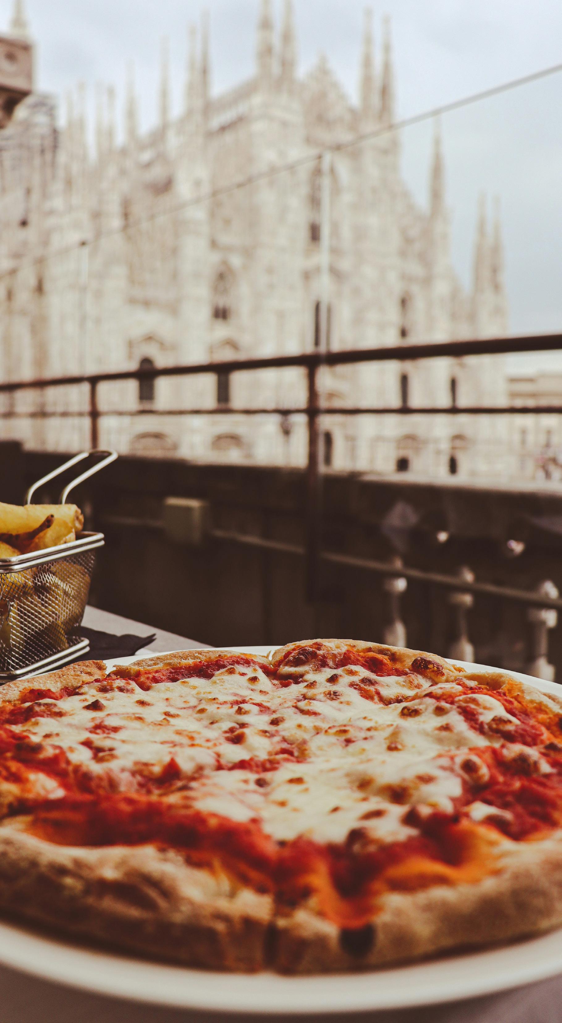 3 Fresh, cheese covered pizza seen on a balcony looking at the front of the Duomo di Milano in Milan, Italy. Photo courtesy of Pexels by Mark Neal via a Free Pexels License.