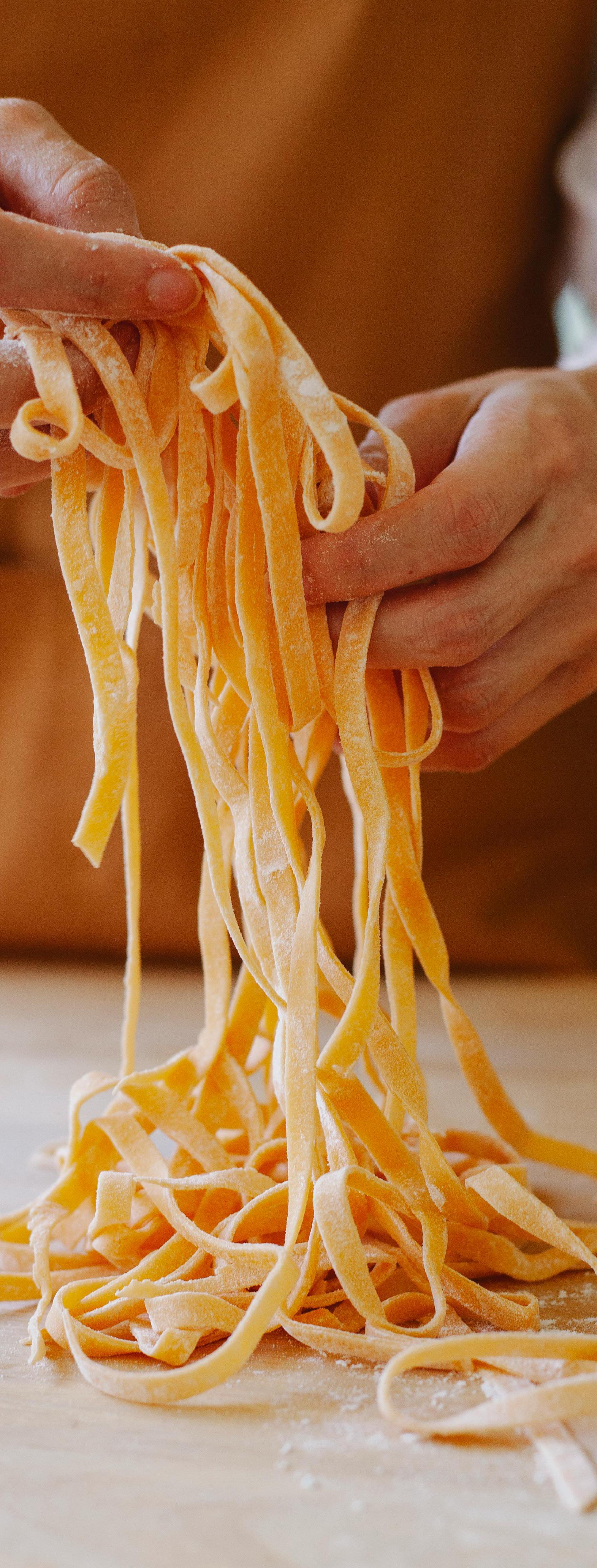 Freshly made pasta is detangled by a chef’s flour covered hands. Photo courtesy of Pexels by Antonius Ferret via a Free Pexels License.