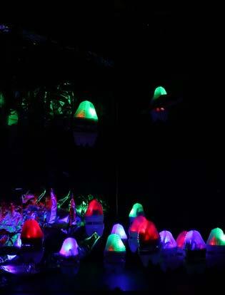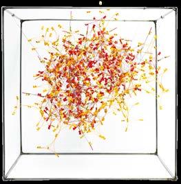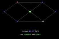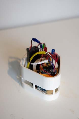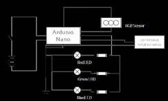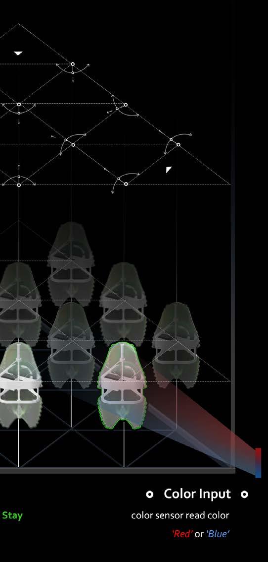 Completed with a group for an AA DRL workshop focused on Arduino and coding, we were given the options to create robots with Machine-Human, Machine-Environment, and MachineMachine interaction. We focused on the last, seeking inspiration from bio-luminescence, underwater creatures, and air balloons. Simplicity in concept was the key to complexity in this case, so we decided to employ the use of color sensing, specifically of red, green, and blue. Initially the goal was a flying robot, but with the time-frame of four weeks, it was more realistic to create the illusion of floating robots. We created a pulley system, with fishing wire attached to a continuous rotational servo. The robots were each comprised of a color sensor, red, green, and blue LEDs, a servo, battery, Arduino nanos, and breadboards. By setting up a higher population of robots, in our case, 18, we were able to identify reactions from a simple rule-set engaging in the emergence of patterns. At first, the robots detected a color and then emitted the same color of detection, but it resulted the eventual entropy of all robots encountering a single state (a single color). The system would then stop. We then turned to the more complex rule-set in which a single color detected converts to a different color (not that of which is detected). The result was a continuous system, with each moment having an overall idiosyncratic state. The complexity brought out from this rule-set resulted in an unpredictable organization.