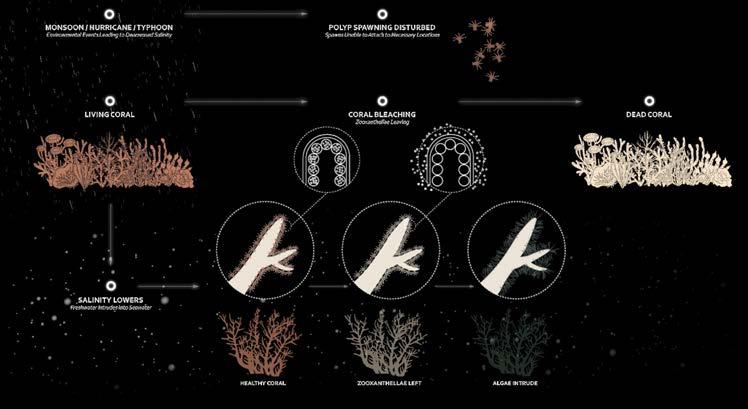 There are many environmental factors contributing to coral bleaching, however, a key variable more recently acknowledged and researched is salinity. When environmental events such as monsoons, hurricanes, and typhoons occur, a sudden influx of freshwater causes salinity to decrease from an average of 35ppm to as little as 10ppm. These events typically occur in coral habitats. This sudden change is shocking to coral, creating imbalances, and ultimately cause the symbiotic organisms, zooxanthellae, that provide coral 90% of its food, and its color, to leave its coral host. The phenomena we know as bleaching is the effect of zooxanthellae leaving its coral host. Bleaching does not mean death, and if conditions return to normal quick enough, the zooxanthellae will return, but if conditions do not change, coral is left as merely a skeleton, later covered by algae. We looked at coral reef typologies to better apply structures and formational types to our agent rehabilitation simulations.