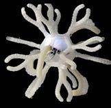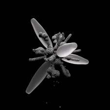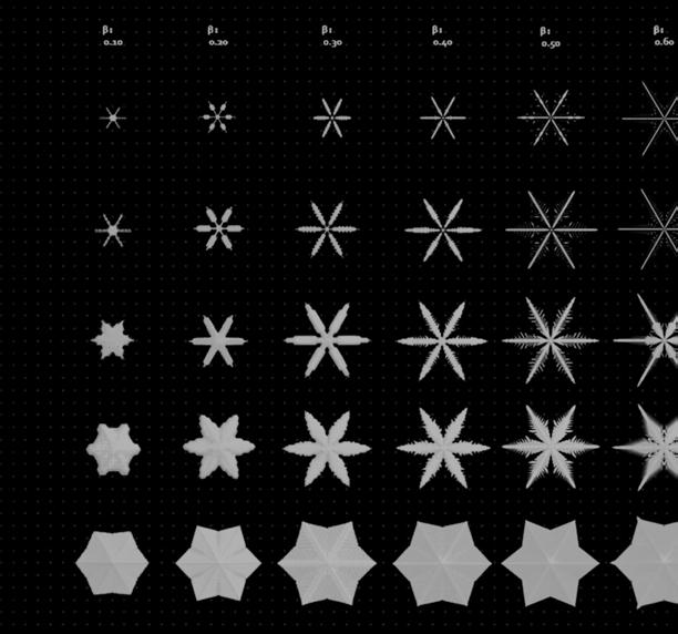 The first iteration began with a simplified 2D geometry with perpendicular intersections which proved useful for initial crystallization experiments on the self-binding nature of salt. Optimization led the spicule to be generated from a 3D geometry with arms attached at the nodes, allowing for more surface area in terms of crystallization seeding points. Applying agency became integral to the spicule design, catalyzing pneumatic elements within the behavioral formation. We tested taxonomies of a single bifurcated arm to understand the crystallization-tosurface-area ratio, giving us insight into optimal end mutations. Ultimately, the reasoning for the spicule was to insight and create a better performing growth vessel. Providing meshing to the spicule allowed porosity necessary for the penetration of saline solution and coral polyps.