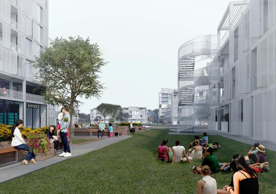 The Phnom Penh Economic Housing project was completed with a fellow intern during a summer internship at Hawkins\ Brown. The competition was proposed by the Phnom Penh Special Economic Zone in association with the United Nations Development Programme SDG Finance Initiative and Building Trust International. Its intention is to cater to the needs of low income which includes affordable housing that is functional for its demographic, performative buildings for the environment, and pleasurable spaces for its users. In order to respond to this call, the team began by strategizing the overall goals of the project which included the optimum awareness of vernacular architecture (such as the Khmer house typology), enhancing that architectural tradition, recognizing the environmental surroundings of the tropical climate, and enabling a good quality of life in an affordable manner through sustainable elements and prefabrication.