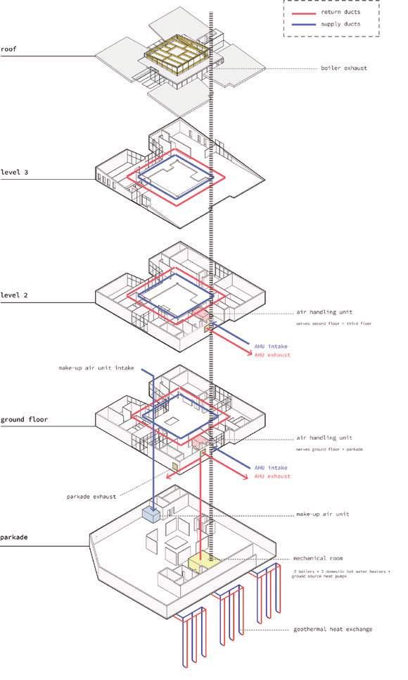 This building uses passive heating strategies through its massing, orientation, solar chimney, triple-pane operable window systems, and